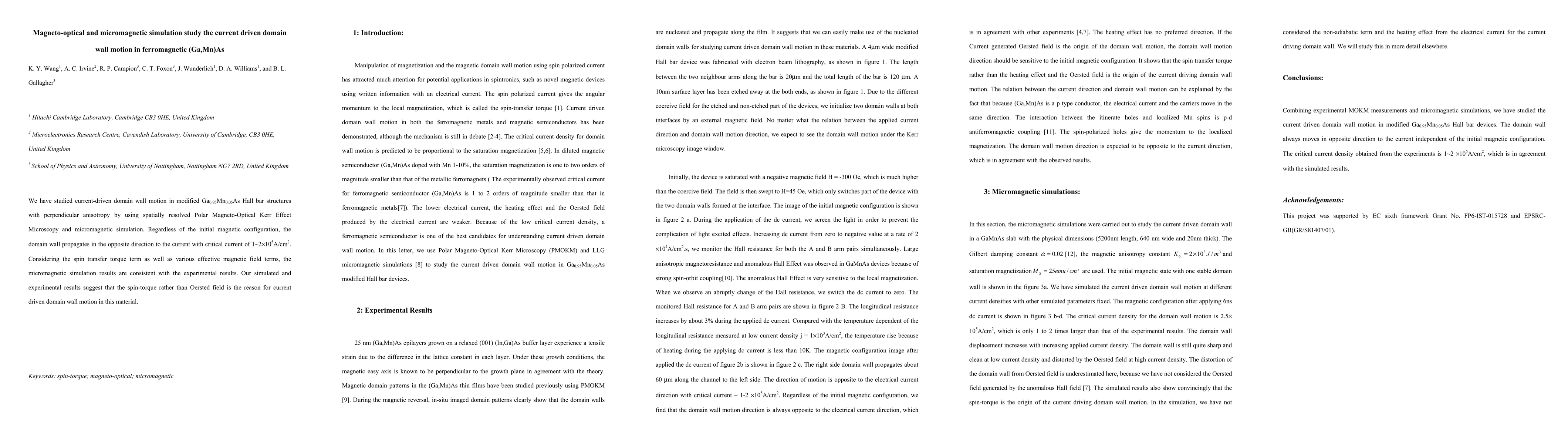 This study investigates current-driven domain wall motion in ferromagnetic (Ga,Mn)As using Magneto-Optical Kerr Effect Microscopy and micromagnetic simulations. The research finds that domain walls move opposite to the current direction, primarily driven by spin-torque effects rather than Oersted fields.