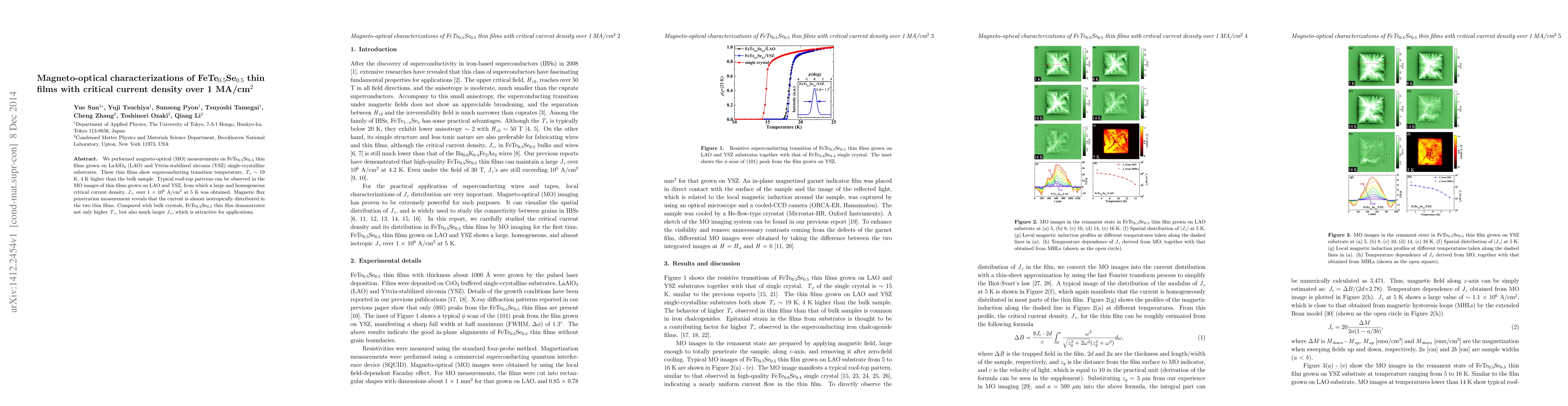 This study investigates FeTe$_{0.5}$Se$_{0.5}$ thin films grown on LAO and YSZ substrates, revealing a superconducting transition temperature of 19 K and a critical current density exceeding 1 MA/cm$^2$ at 5 K, significantly higher than bulk samples. The films exhibit isotropic current distribution and enhanced superconducting properties, making them promising for applications.