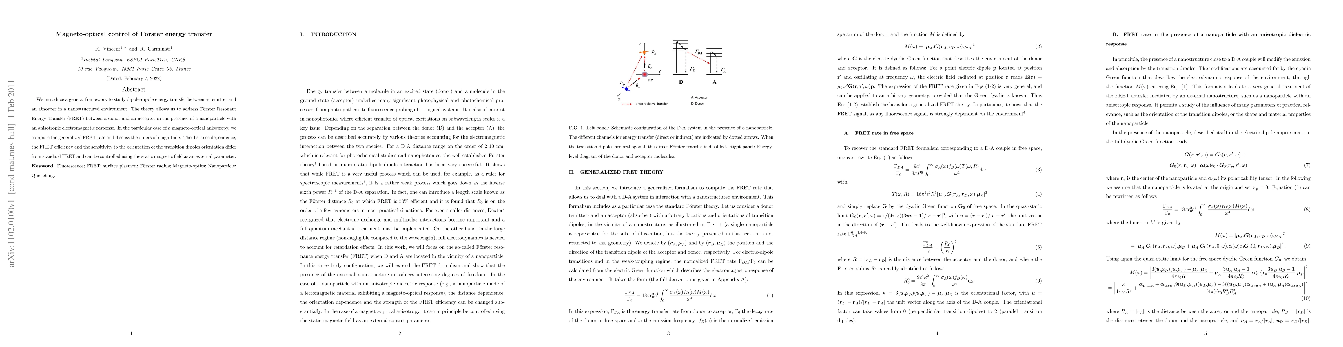 We introduce a general framework to study dipole-dipole energy transfer between an emitter and an absorber in a nanostructured environment. The theory allows us to address F\"orster Resonant Energy Transfer (FRET) between a donor and an acceptor in the presence of a nanoparticle with an anisotropic electromagnetic response. In the particular case of a magneto-optical anisotropy, we compute the generalized FRET rate and discuss the orders of magnitude. The distance dependence, the FRET efficiency and the sensitivity to the orientation of the transition dipoles orientation differ from standard FRET and can be controlled using the static magnetic field as an external parameter.