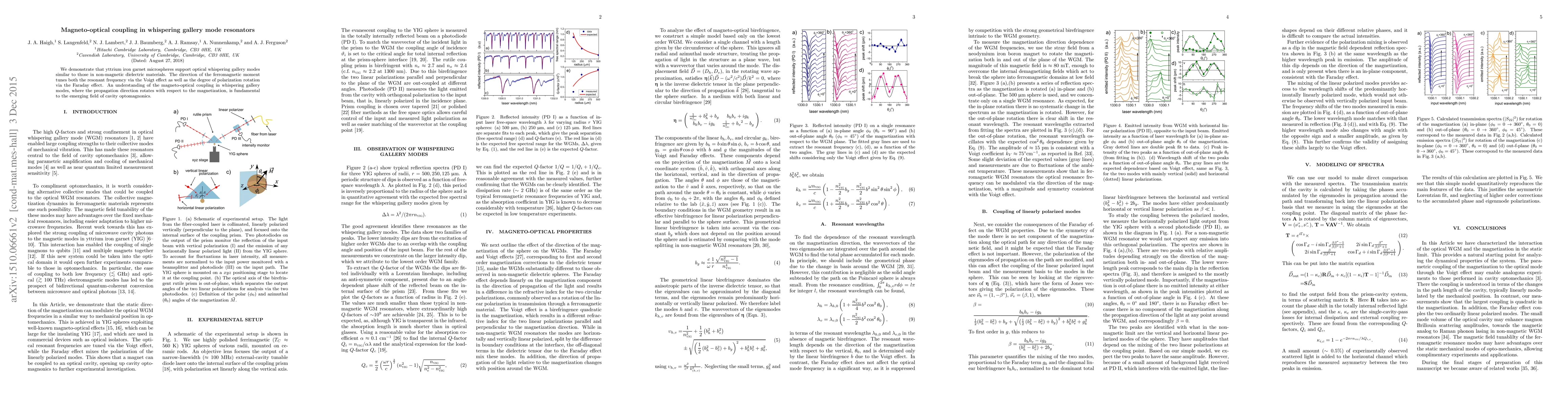 We demonstrate that yttrium iron garnet microspheres support optical whispering gallery modes similar to those in non-magnetic dielectric materials. The direction of the ferromagnetic moment tunes both the resonant frequency via the Voigt effect as well as the degree of polarization rotation via the Faraday effect. An understanding of the magneto-optical coupling in whispering gallery modes, where the propagation direction rotates with respect to the magnetization, is fundamental to the emerging field of cavity optomagnonics.