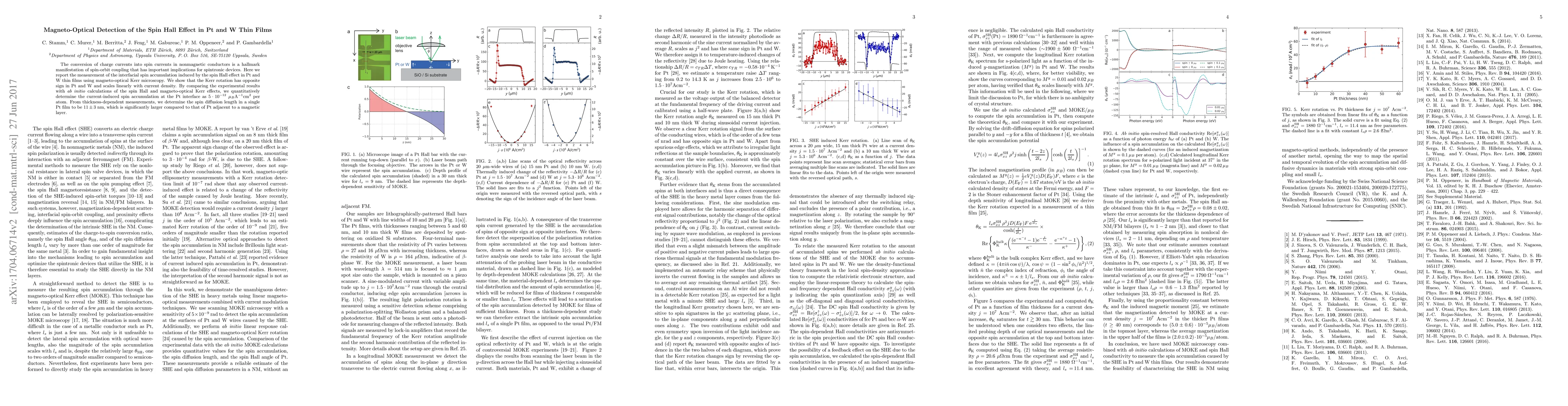 Here we report the measurement of the interfacial spin accumulation induced by the spin Hall effect in Pt and W thin films using magneto-optical Kerr microscopy. We show that the Kerr rotation has opposite sign in Pt and W and scales linearly with current density. By comparing the experimental results with ab-initio calculations of the spin Hall and magneto-optical Kerr effects, we quantitatively determine the current-induced spin accumulation at the Pt interface as $5*10^{-12} \mu_B$A$^{-1}$cm$^2$ per atom. From thickness-dependent measurements, we determine the spin diffusion length in a single Pt film to be $11 \pm 3$ nm, which is significantly larger compared to that of Pt adjacent to a magnetic layer.