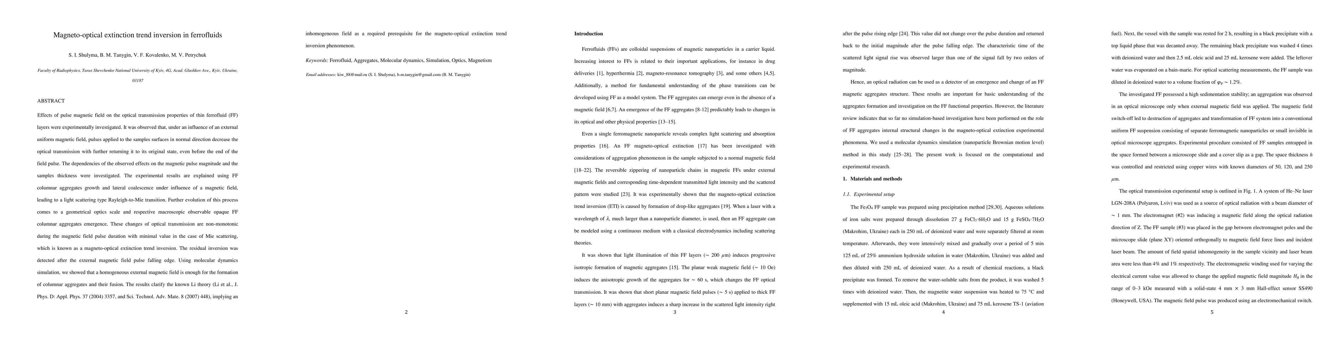 Effects of pulse magnetic field on the optical transmission properties of thin ferrofluid (FF) layers were experimentally investigated. It was observed that, under an influence of an external uniform magnetic field, pulses applied to the samples surfaces in normal direction decrease the optical transmission with further returning it to its original state, even before the end of the field pulse. The dependencies of the observed effects on the magnetic pulse magnitude and the samples thickness were investigated. The experimental results are explained using FF columnar aggregates growth and lateral coalescence under influence of a magnetic field, leading to a light scattering type Rayleigh-to-Mie transition. Further evolution of this process comes to a geometrical optics scale and respective macroscopic observable opaque FF columnar aggregates emergence. These changes of optical transmission are non-monotonic during the magnetic field pulse duration with minimal value in the case of Mie scattering, which is known as a magneto-optical extinction trend inversion. The residual inversion was detected after the external magnetic field pulse falling edge. Using molecular dynamics simulation, we showed that a homogeneous external magnetic field is enough for the formation of columnar aggregates and their fusion. The results clarify the known Li theory (Li et al., J. Phys. D: Appl. Phys. 37 (2004) 3357, and Sci. Technol. Adv. Mate. 8 (2007) 448), implying an inhomogeneous field as a required prerequisite for the magneto-optical extinction trend inversion phenomenon.