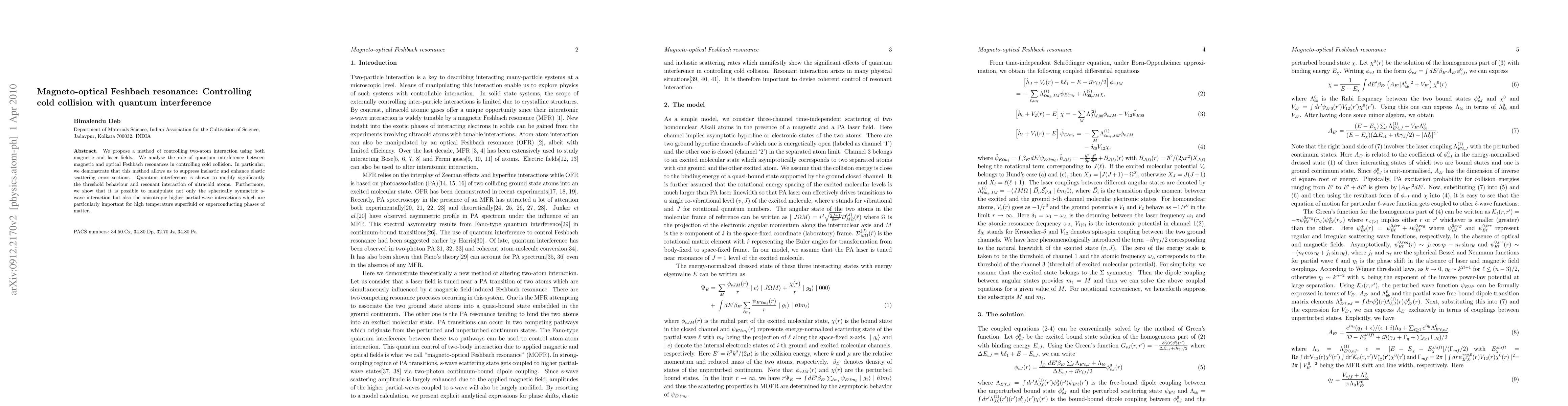 We propose a method of controlling two-atom interaction using both magnetic and laser fields. We analyse the role of quantum interference between magnetic and optical Feshbach resonances in controlling cold collision. In particular, we demonstrate that this method allows us to suppress inelastic and enhance elastic scattering cross sections. Quantum interference is shown to modify significantly the threshold behaviour and resonant interaction of ultracold atoms. Furthermore, we show that it is possible to manipulate not only the spherically symmetric s-wave interaction but also the anisotropic higher partial-wave interactions which are particularly important for high temperature superfluid or superconducting phases of matter.