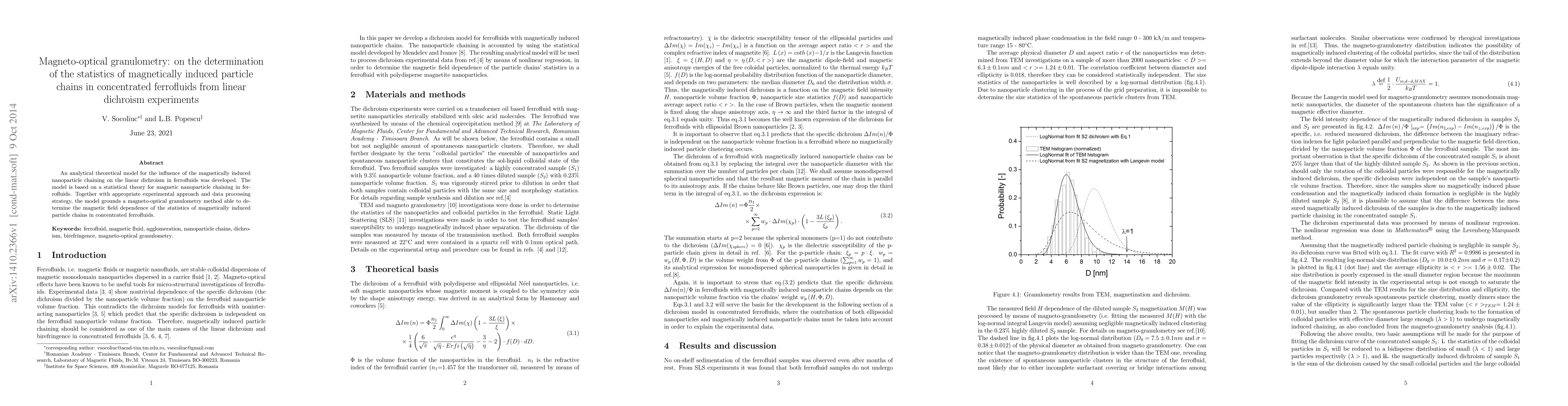 This paper develops a theoretical model to analyze the linear dichroism in concentrated ferrofluids, linking magnetic nanoparticle chaining to optical properties. The model, combined with experimental techniques, enables magneto-optical granulometry to determine the statistical behavior of magnetically induced particle chains under varying magnetic fields.