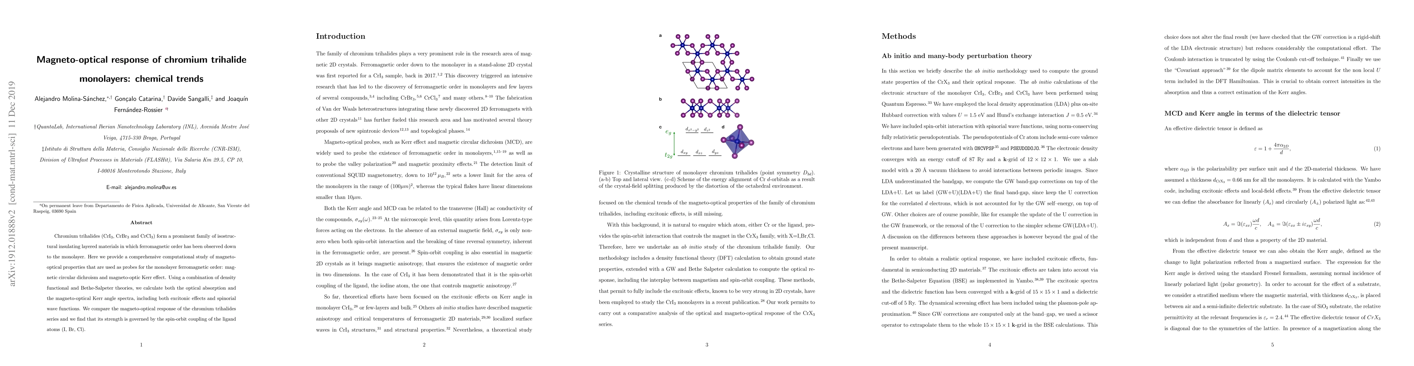 Chromium trihalides (CrI$_3$, CrBr$_3$ and CrCl$_3$) form a prominent family of isostructural insulating layered materials in which ferromagnetic order has been observed down to the monolayer. Here we provide a comprehensive computational study of magneto-optical properties that are used as probes for the monolayer ferromagnetic order: magnetic circular dichroism and magneto-optic Kerr effect. Using a combination of density functional and Bethe-Salpeter theories, we calculate both the optical absorption and the magneto-optical Kerr angle spectra, including both excitonic effects and spinorial wave functions. We compare the magneto-optical response of the chromium trihalides series and we find that its strength is governed by the spin-orbit coupling of the ligand atoms (I, Br, Cl).