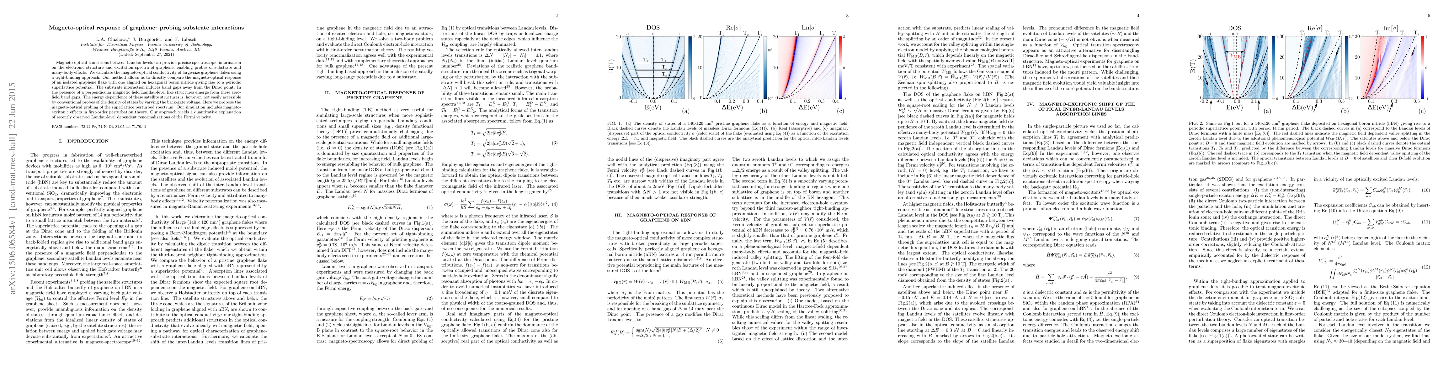 This research investigates magneto-optical transitions in graphene flakes on hexagonal boron nitride substrates, revealing substrate-induced band gaps and their Landau-level-like structures under magnetic fields. The study proposes a new method for probing these effects through magneto-optical conductivity.