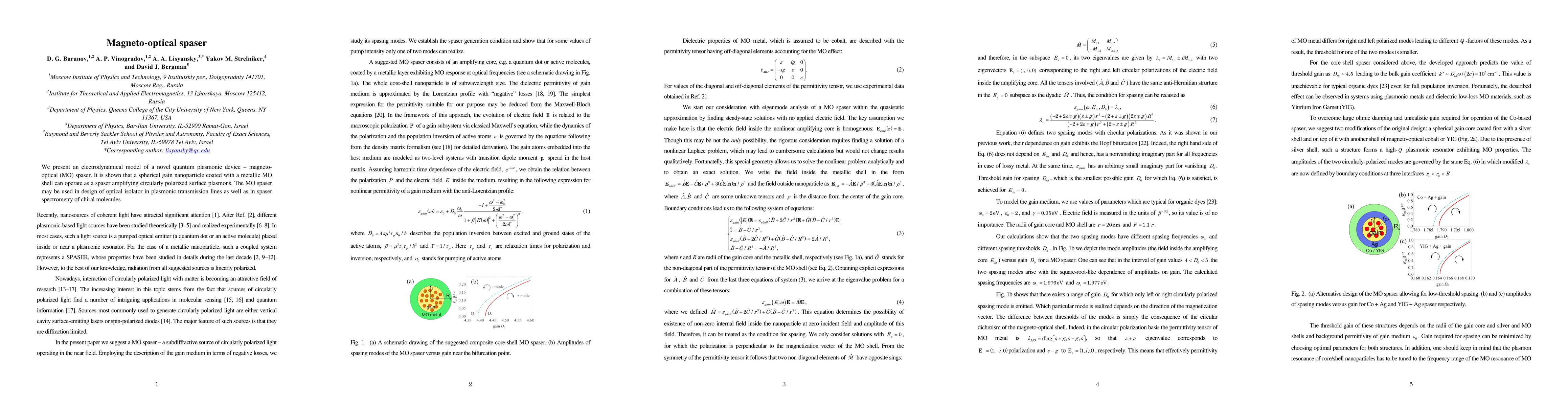 This research introduces a magneto-optical spaser, a quantum plasmonic device that amplifies circularly polarized surface plasmons using a spherical nanoparticle coated with a metallic magneto-optical shell. It shows potential applications in optical isolators and chiral molecule spectrometry.