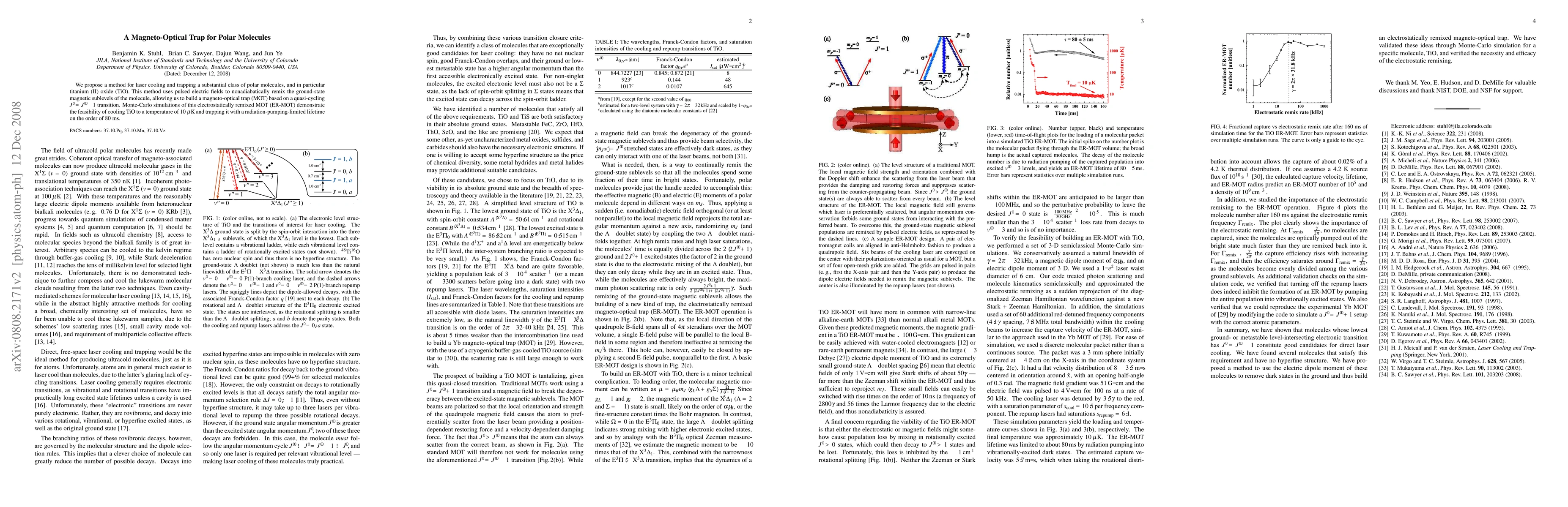 This paper proposes a magneto-optical trap method for cooling and trapping polar molecules like titanium (II) oxide using pulsed electric fields to remix magnetic sublevels. Monte-Carlo simulations show the potential to cool TiO to 10 μK with a trapping lifetime of 80 ms.