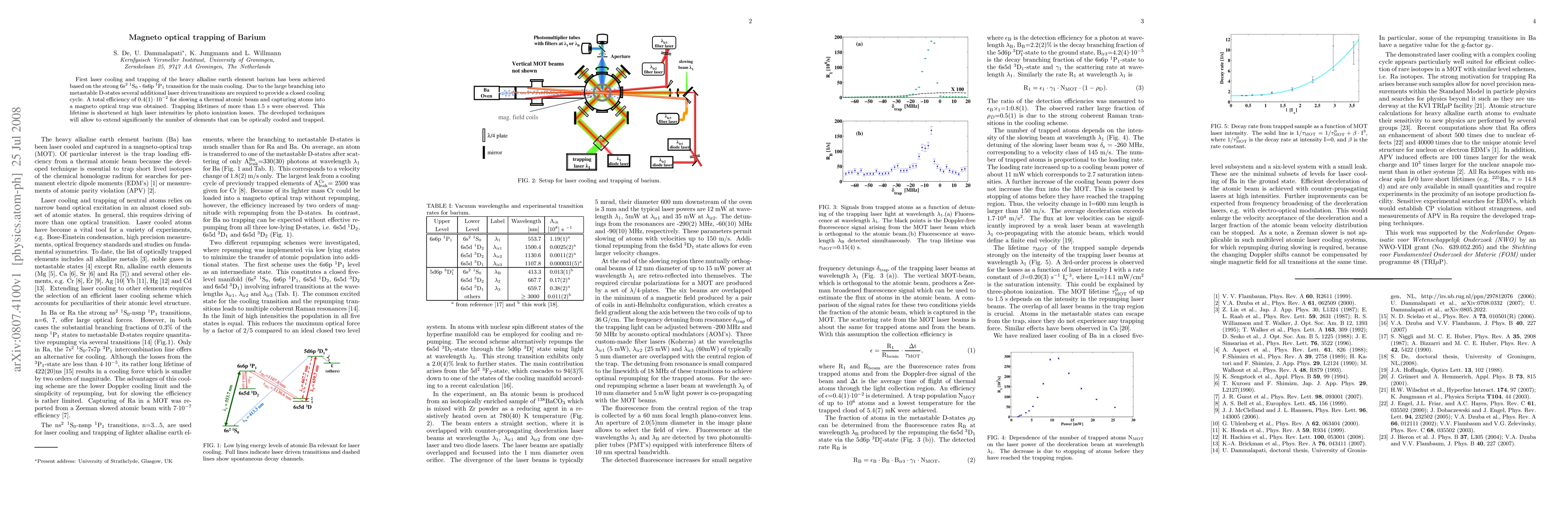 This paper reports the first laser cooling and trapping of barium using its strong 6s$^2$ $^1$S$_0$ - 6s6p $^1$P$_1$ transition, supplemented by additional laser-driven transitions to complete the cooling cycle. The achieved trapping efficiency and lifetimes of over 1.5 seconds pave the way for extending optical cooling techniques to more elements.