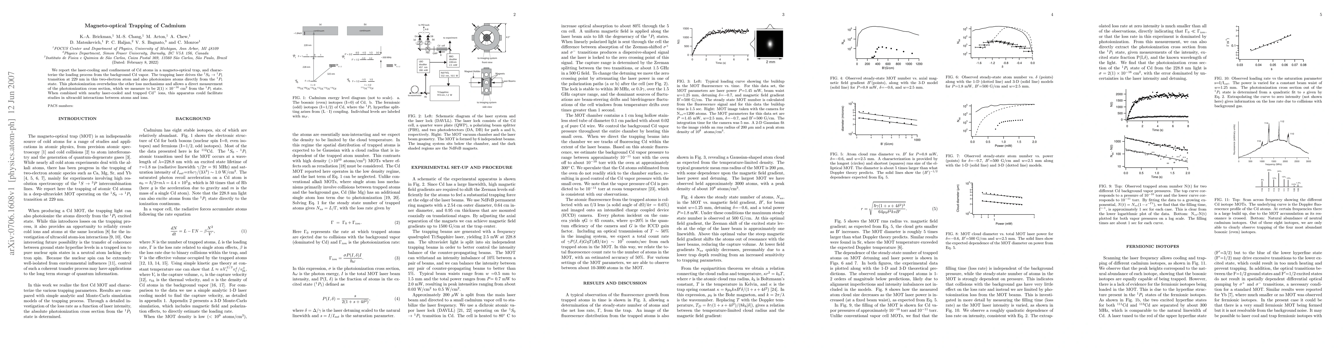 We report the laser-cooling and confinement of Cd atoms in a magneto-optical trap, and characterize the loading process from the background Cd vapor. The trapping laser drives the 1S0-1P1 transition at 229 nm in this two-electron atom and also photoionizes atoms directly from the 1P1 state. This photoionization overwhelms the other loss mechanisms and allows a direct measurement of the photoionization cross section, which we measure to be 2(1)x10^(-16)cm^(2) from the 1P1 state. When combined with nearby laser-cooled and trapped Cd^(+) ions, this apparatus could facilitate studies in ultracold interactions between atoms and ions.