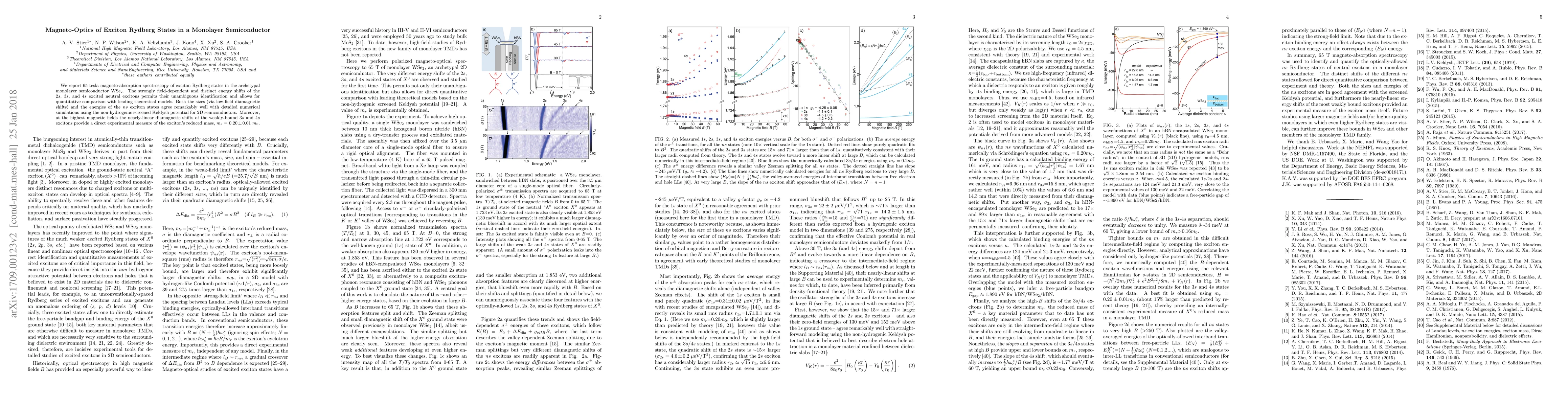 We report 65 tesla magneto-absorption spectroscopy of exciton Rydberg states in the archetypal monolayer semiconductor WSe$_2$. The strongly field-dependent and distinct energy shifts of the 2s, 3s, and 4s excited neutral excitons permits their unambiguous identification and allows for quantitative comparison with leading theoretical models. Both the sizes (via low-field diamagnetic shifts) and the energies of the $ns$ exciton states agree remarkably well with detailed numerical simulations using the non-hydrogenic screened Keldysh potential for 2D semiconductors. Moreover, at the highest magnetic fields the nearly-linear diamagnetic shifts of the weakly-bound 3s and 4s excitons provide a direct experimental measure of the exciton's reduced mass, $m_r = 0.20 \pm 0.01~m_0$.