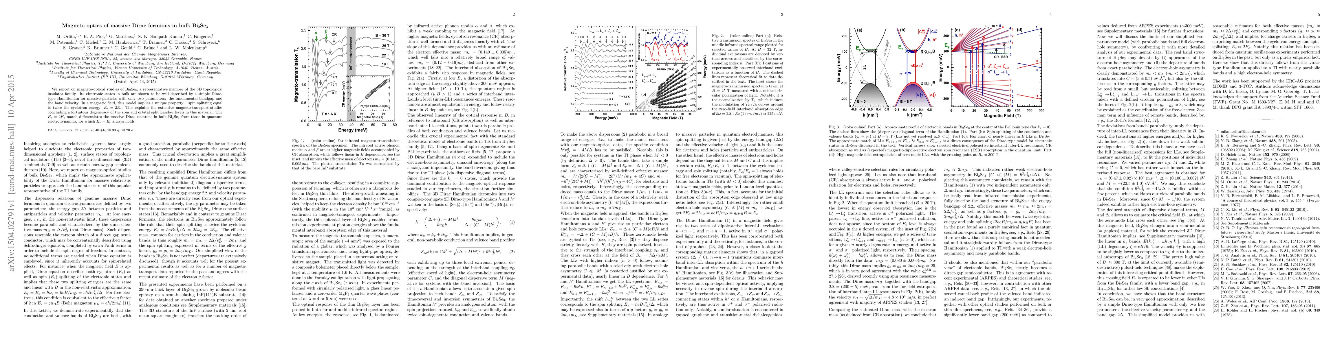 We report on magneto-optical studies of Bi2Se3, a representative member of the 3D topological insulator family. Its electronic states in bulk are shown to be well described by a simple Dirac-type Hamiltonian for massive particles with only two parameters: the fundamental bandgap and the band velocity. In a magnetic field, this model implies a unique property - spin splitting equal to twice the cyclotron energy: Es = 2Ec. This explains the extensive magneto-transport studies concluding a fortuitous degeneracy of the spin and orbital split Landau levels in this material. The Es = 2Ec match differentiates the massive Dirac electrons in bulk Bi2Se3 from those in quantum electrodynamics, for which Es = Ec always holds.