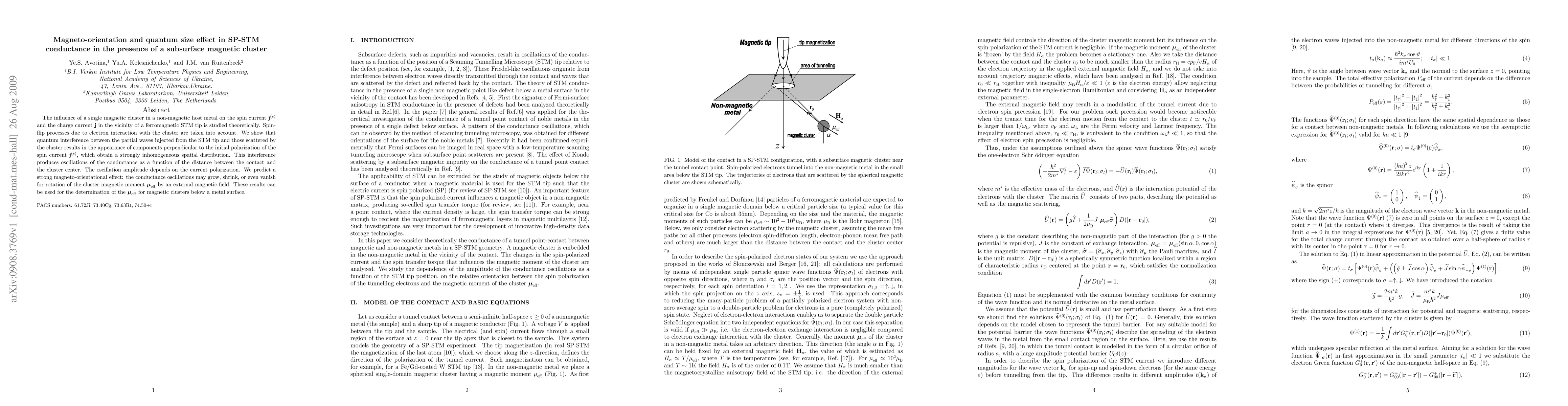 The influence of a single magnetic cluster in a non-magnetic host metal on the spin current $\mathbf{j}^{(s)}$ and the charge current $\mathbf{j}$ in the vicinity of a ferromagnetic STM tip is studied theoretically. Spin-flip processes due to electron interaction with the cluster are taken into account. We show that quantum interference between the partial waves injected from the STM tip and those scattered by the cluster results in the appearance of components perpendicular to the initial polarization of the spin current $\mathbf{j}^{(s)}$, which obtain a strongly inhomogeneous spatial distribution. This interference produces oscillations of the conductance as a function of the distance between the contact and the cluster center. The oscillation amplitude depends on the current polarization. We predict a strong magneto-orientational effect: the conductance oscillations may grow, shrink, or even vanish for rotation of the cluster magnetic moment $\mathbf{\mu}_{\mathrm{eff}}$ by an external magnetic field. These results can be used for the determination of the $ \mathbf{\mu}_{\mathrm{eff}}$ for magnetic clusters below a metal surface.