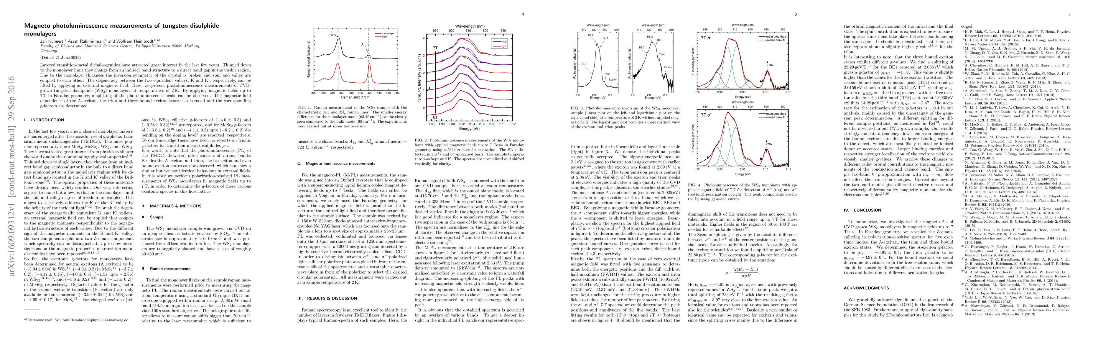 Layered transition-metal dichalcogenides have attracted great interest in the last few years. Thinned down to the monolayer limit they change from an indirect band structure to a direct band gap in the visible region. Due to the monolayer thickness the inversion symmetry of the crystal is broken and spin and valley are coupled to each other. The degeneracy between the two equivalent valleys, K and K', respectively, can be lifted by applying an external magnetic field. Here, we present photoluminescence measurements of CVD-grown tungsten disulphide (WS${_2}$) monolayers at temperatures of 2 K. By applying magnetic fields up to 7 T in Faraday geometry, a splitting of the photoluminescence peaks can be observed. The magnetic field dependence of the A-exciton, the trion and three bound exciton states is discussed and the corresponding g-factors are determined.