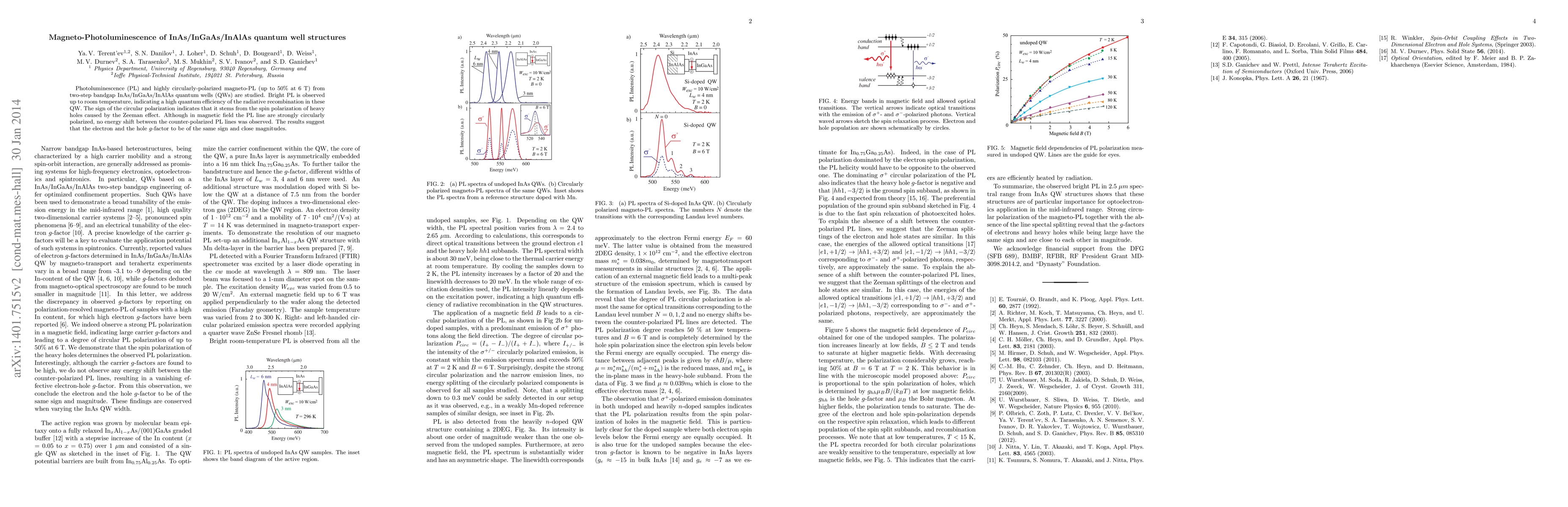 This study investigates the magneto-photoluminescence in InAs/InGaAs/InAlAs quantum well structures, revealing bright and highly circularly-polarized photoluminescence up to room temperature, attributed to the Zeeman effect on spin-polarized heavy holes. Despite strong polarization, no energy shift was observed, implying similar and positive g-factors for electrons and holes.