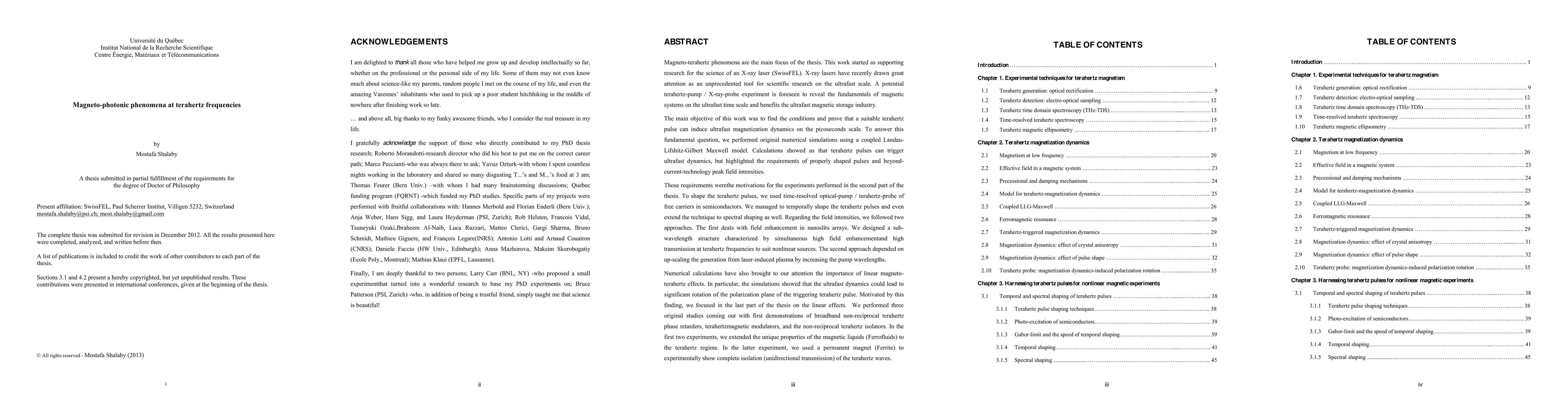 This research explores magneto-terahertz phenomena at terahertz frequencies, focusing on numerical simulations and experimental demonstrations of novel terahertz devices. The study highlights the development of non-reciprocal terahertz phase retarders, magnetic modulators, and isolators, leveraging the unique properties of magnetic liquids and permanent magnets.