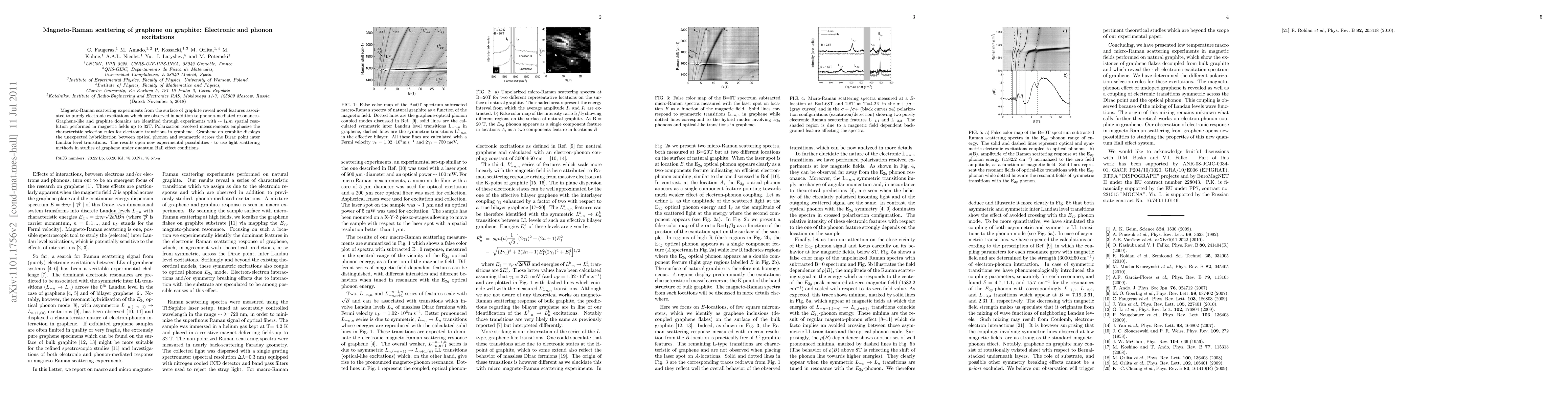 This study employs magneto-Raman scattering to identify electronic and phonon excitations in graphene on graphite, revealing novel hybridized transitions and distinguishing graphene domains with high spatial resolution. The findings suggest new avenues for using light scattering to study graphene under quantum Hall conditions.