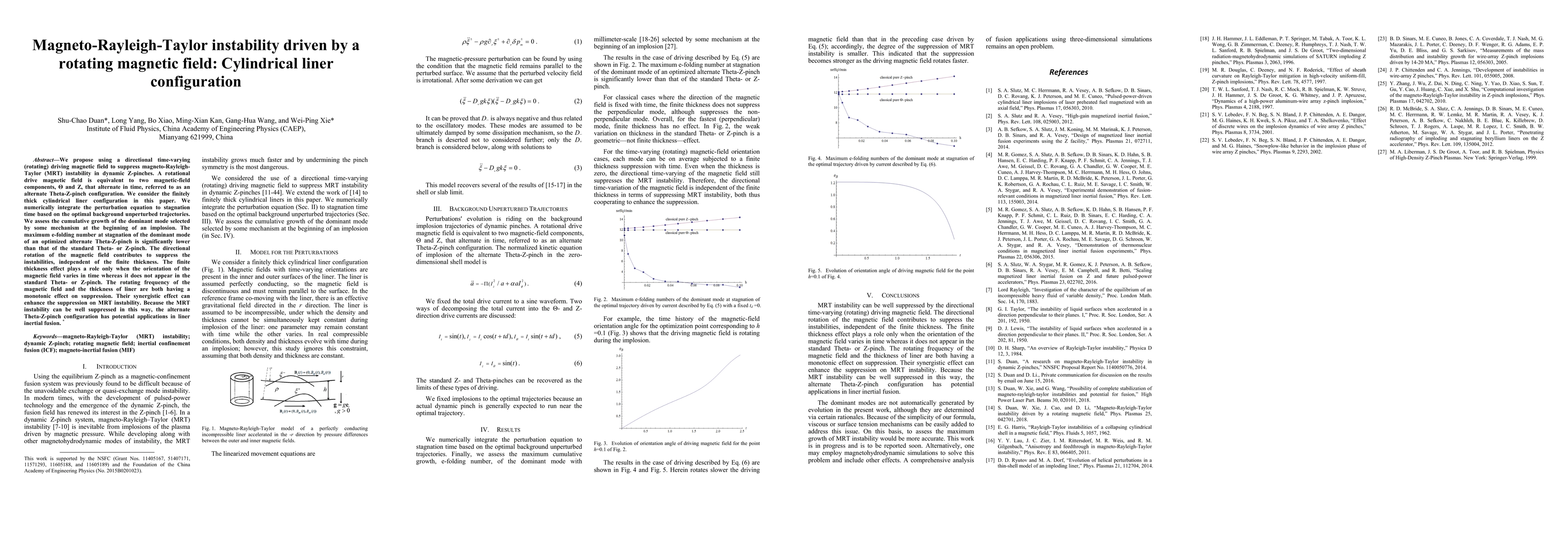 This paper proposes using a rotating magnetic field to suppress magneto-Rayleigh-Taylor instability in Z-pinches, finding that the alternate Theta-Z-pinch configuration significantly reduces instability growth compared to standard configurations. The study highlights the synergistic effect of magnetic field rotation frequency and liner thickness in enhancing the suppression.