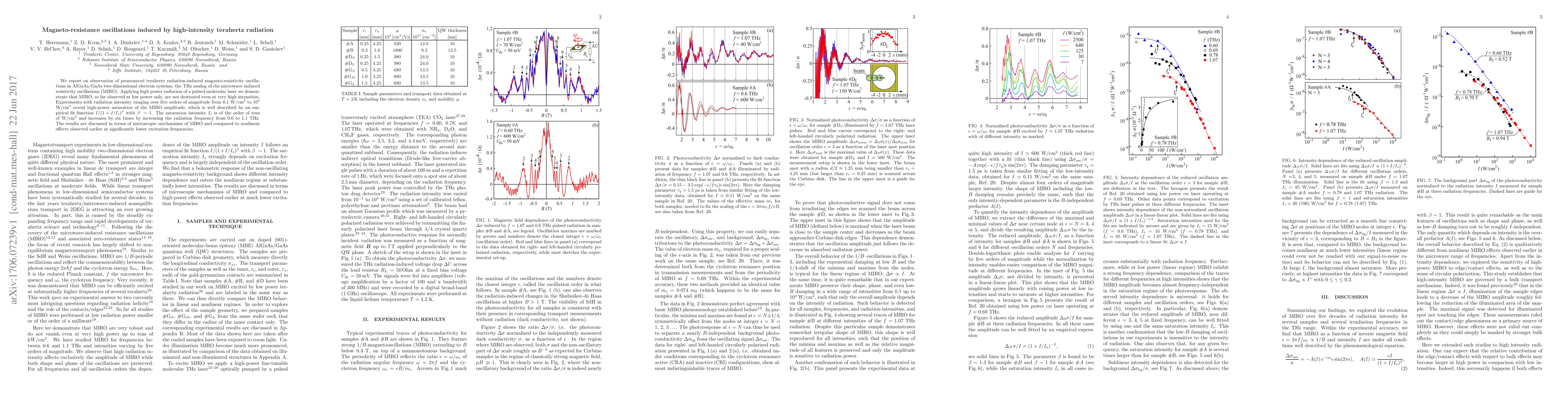 The paper reports the observation of magneto-resistance oscillations in AlGaAs/GaAs systems under high-intensity terahertz radiation, demonstrating that these oscillations, previously seen at low power, remain stable even at very high intensities. The study reveals a high-power saturation of the oscillation amplitude, described by an empirical function, with saturation intensity increasing with radiation frequency.
