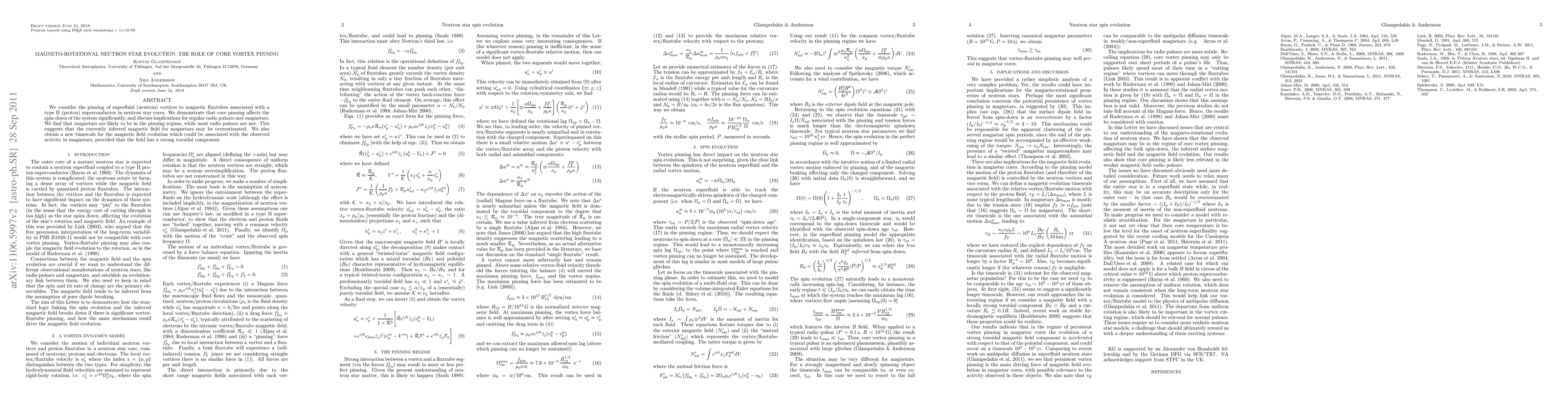 Neutron star evolution is influenced by core vortex pinning, which affects magnetic field spin-down, with magnetars likely in the pinning regime and radio pulsars not.