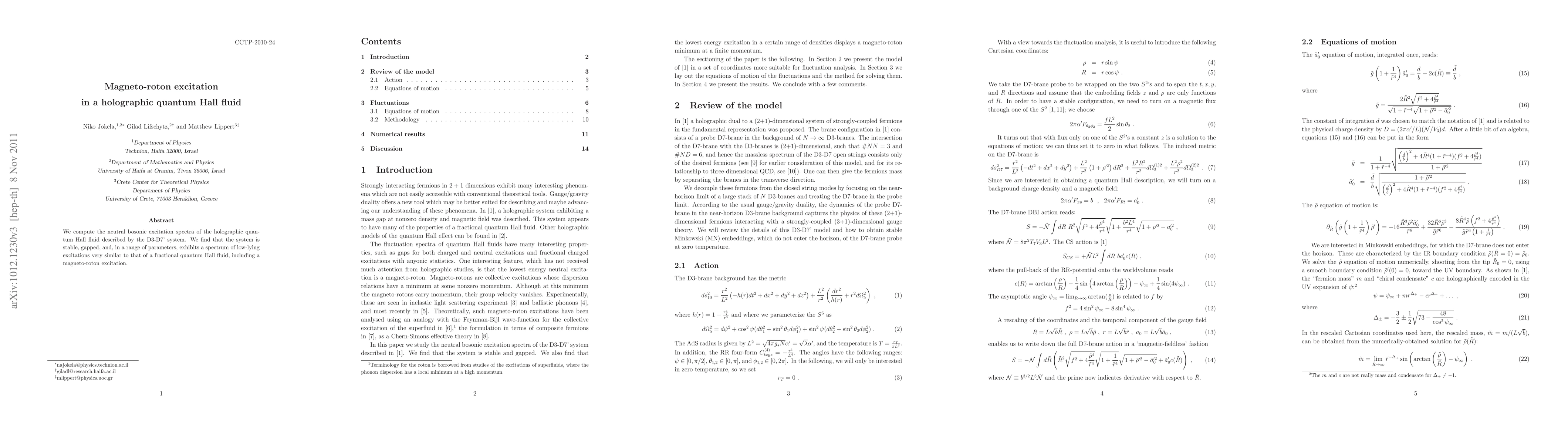 We compute the neutral bosonic excitation spectra of the holographic quantum Hall fluid described by the D3-D7' system. We find that the system is stable, gapped, and, in a range of parameters, exhibits a spectrum of low-lying excitations very similar to that of a quantum Hall fluid, including a magneto-roton excitation.