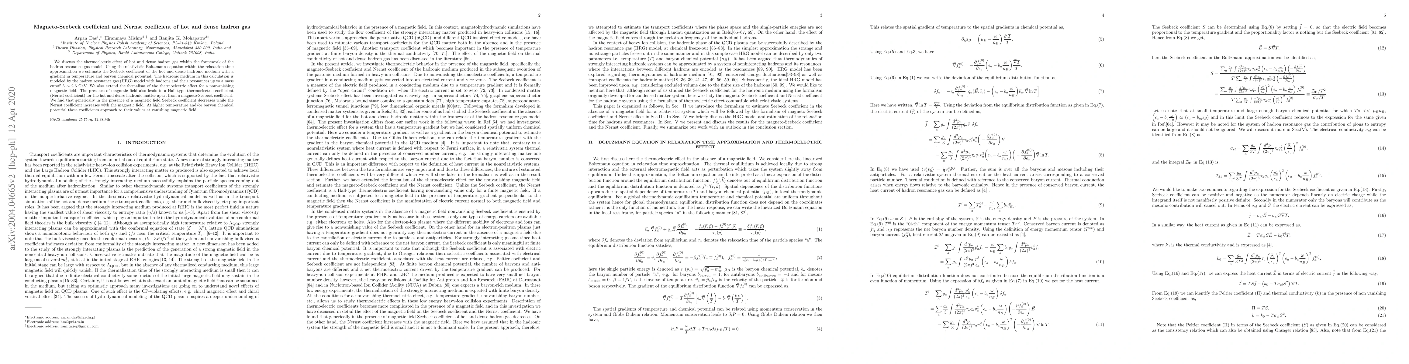 This paper investigates the thermoelectric effects in hot and dense hadron gas using the hadron resonance gas model, estimating the Seebeck and Nernst coefficients. It finds that the Seebeck coefficient decreases while the Nernst coefficient increases with a magnetic field, reverting to their values without a magnetic field at higher temperatures or baryon chemical potentials.