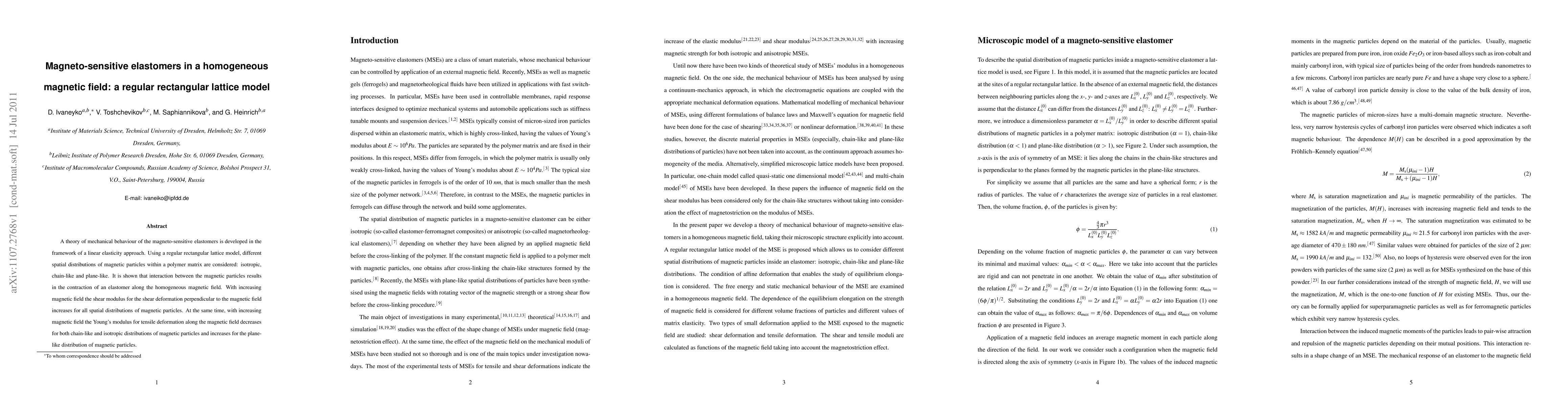 This paper develops a linear elasticity theory for magneto-sensitive elastomers, modeling their mechanical behavior using a regular rectangular lattice. It finds that magnetic particle interactions cause elastomer contraction along the magnetic field, with varying effects on shear and Young's moduli depending on the spatial distribution of magnetic particles.
