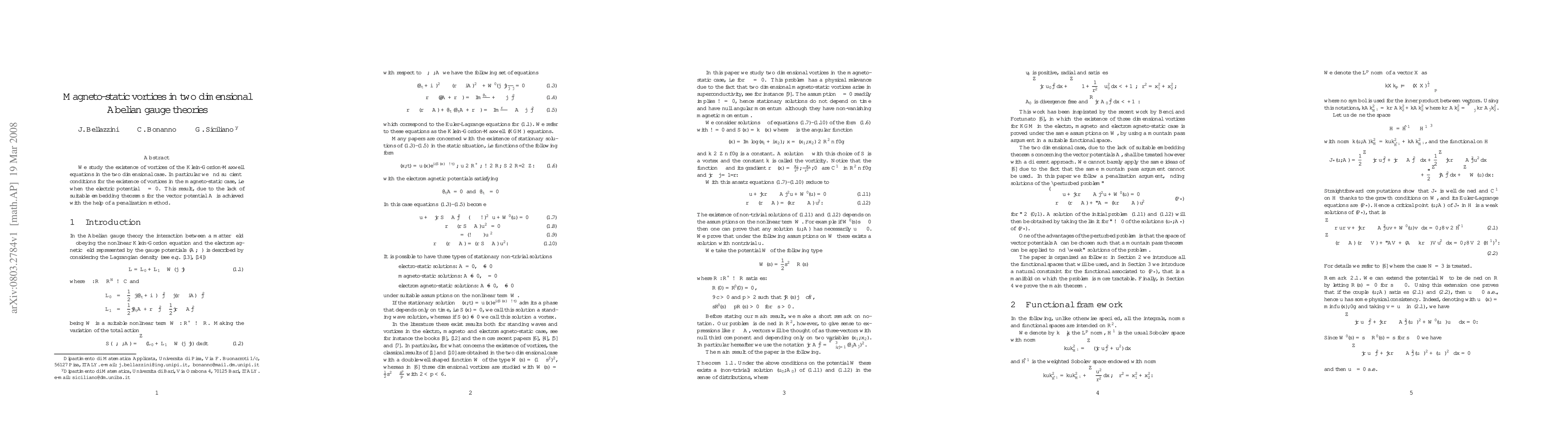 We study the existence of vortices of the Klein-Gordon-Maxwell equations in the two dimensional case. In particular we find sufficient conditions for the existence of vortices in the magneto-static case, i.e when the electric potential $\phi=0$. This result, due to the lack of suitable embedding theorems for the vector potential $\A$ is achieved with the help of a penalization method.