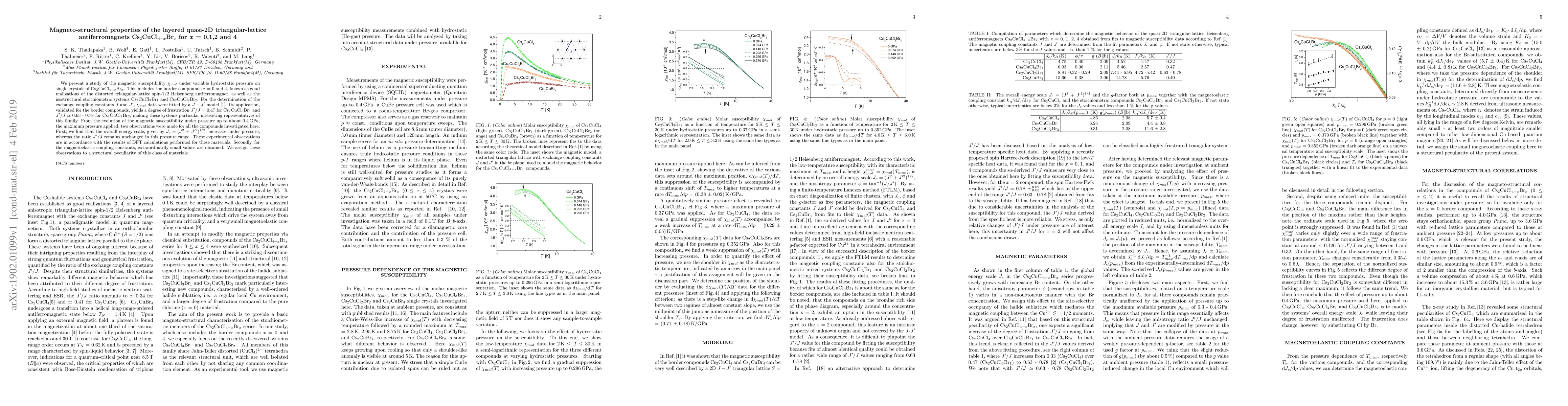 This study investigates the magnetic susceptibility of layered quasi-2D triangular-lattice antiferromagnets Cs$_2$CuCl$_{4-x}$Br$_x$ under hydrostatic pressure, revealing that the energy scale increases with pressure while the degree of frustration remains constant. The findings highlight the structural peculiarity and magnetoelastic coupling in these materials.