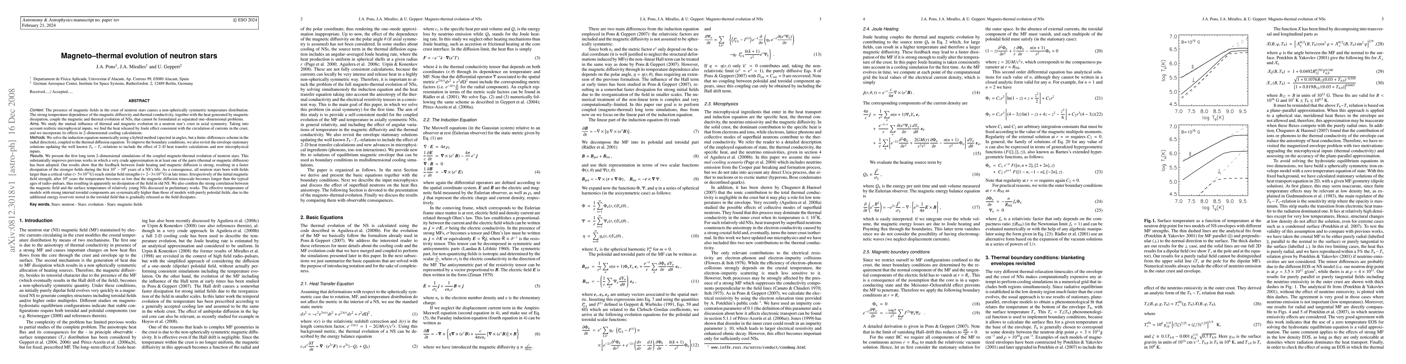The paper presents the first 2D simulations of magneto-thermal evolution of neutron stars, incorporating realistic microphysical inputs and general relativistic corrections, which provide a more accurate description of the interplay between thermal and magnetic evolution.
