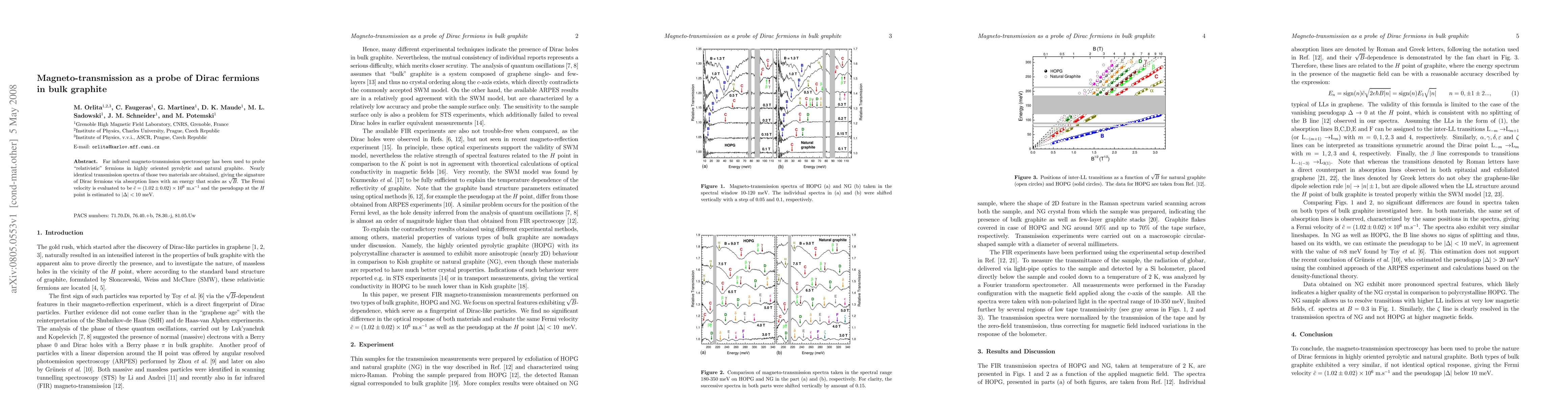 Far infrared magneto-transmission spectroscopy has been used to probe "relativistic" fermions in highly oriented pyrolytic and natural graphite. Nearly identical transmission spectra of those two materials are obtained, giving the signature of Dirac fermions via absorption lines with an energy that scales as \sqrt{B}. The Fermi velocity is evaluated to be c*=1.02x10^6 m/s and the pseudogap at the H point is estimated to be below 10 meV.