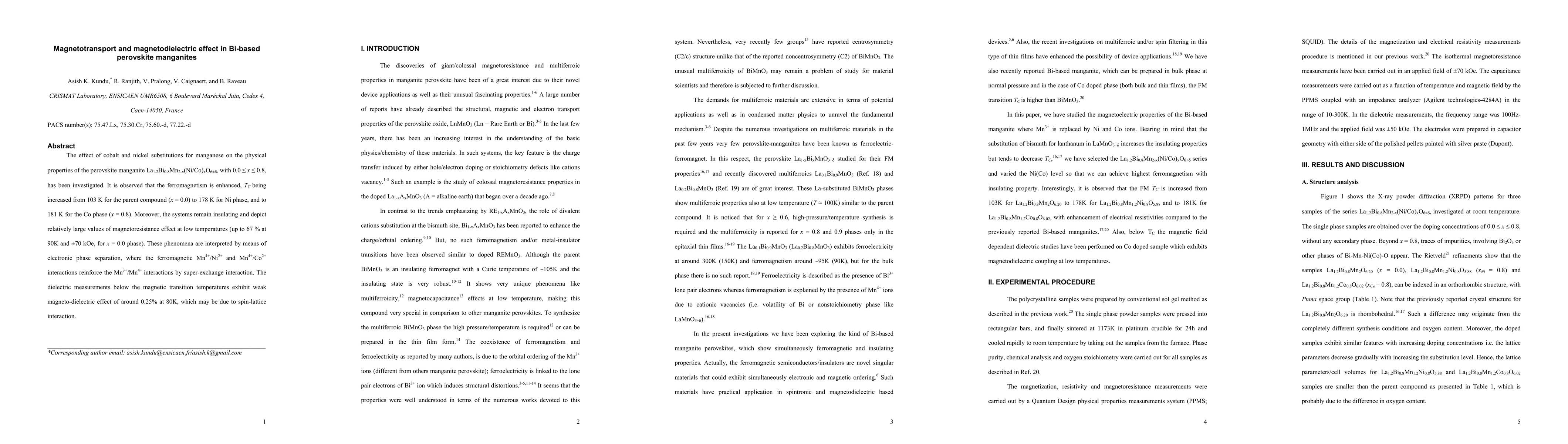 This study investigates cobalt and nickel substitutions in La1.2Bi0.8Mn2-x(Ni/Co)xO6+d perovskite manganites, finding enhanced ferromagnetism and increased Curie temperatures up to 181 K for Co-phase. The materials exhibit insulating behavior and significant magnetoresistance, attributed to electronic phase separation and super-exchange interactions.