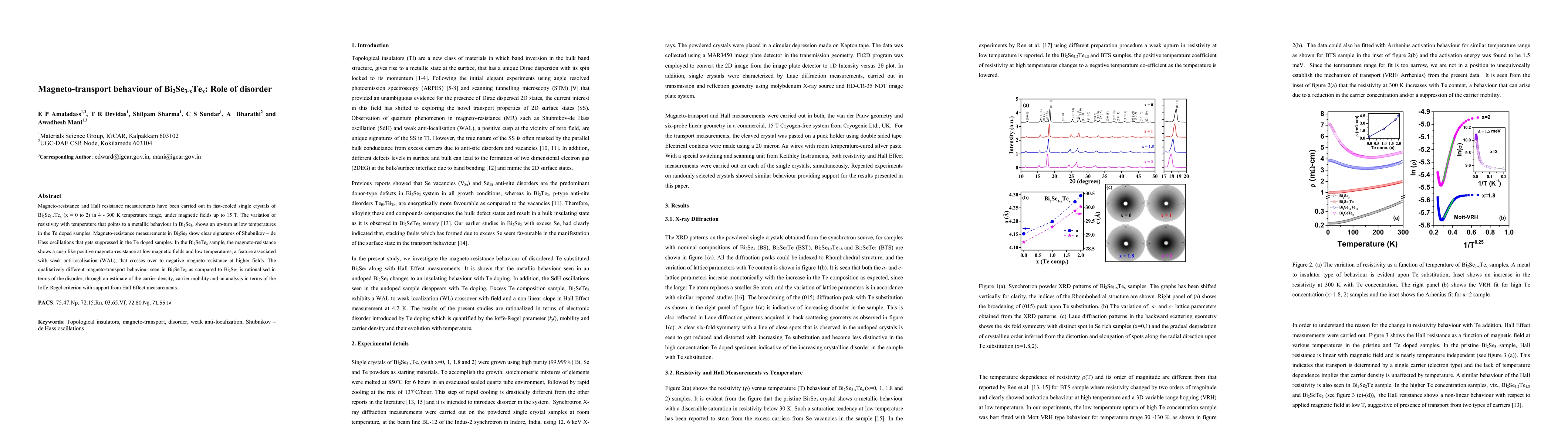 This study investigates the magneto-transport properties of Bi2Se3-xTex single crystals, revealing metallic behaviour in pure Bi2Se3 with an upturn in resistivity at low temperatures in Te-doped samples. The magnetoresistance in Bi2Se3 shows Shubnikov de Hass oscillations, which are suppressed in Te-doped samples, and Bi2SeTe2 exhibits a transition from weak antilocalisation to negative magneto-resistance, attributed to disorder effects.