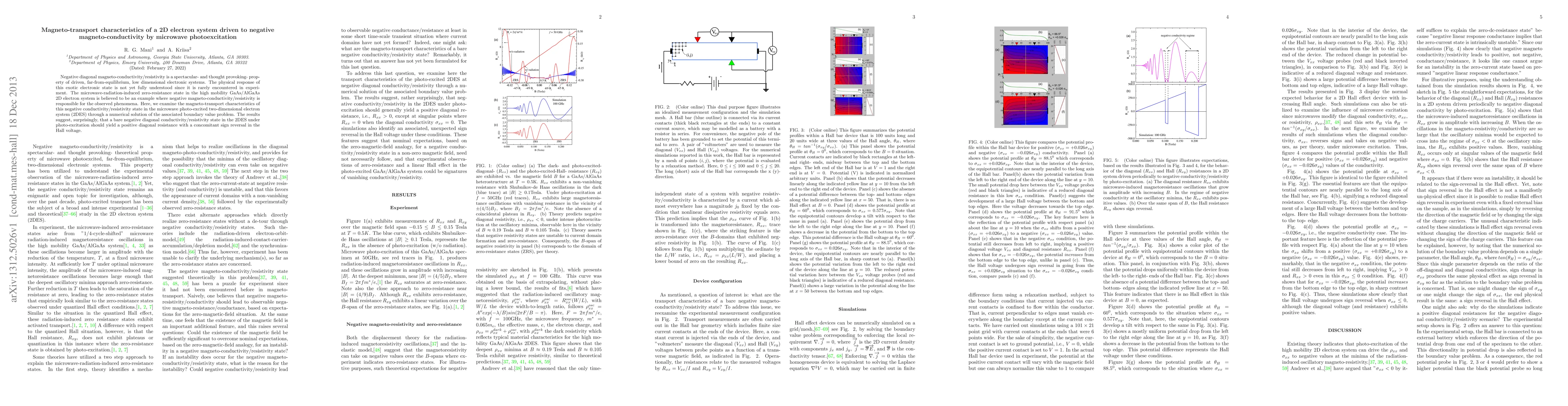Negative diagonal magneto-conductivity/resistivity is a spectacular- and thought provoking- property of driven, far-from-equilibrium, low dimensional electronic systems. The physical response of this exotic electronic state is not yet fully understood since it is rarely encountered in experiment. The microwave-radiation-induced zero-resistance state in the high mobility GaAs/AlGaAs 2D electron system is believed to be an example where negative magneto-conductivity/resistivity is responsible for the observed phenomena. Here, we examine the magneto-transport characteristics of this negative conductivity/resistivity state in the microwave photo-excited two-dimensional electron system (2DES) through a numerical solution of the associated boundary value problem. The results suggest, surprisingly, that a bare negative diagonal conductivity/resistivity state in the 2DES under photo-excitation should yield a positive diagonal resistance with a concomitant sign reversal in the Hall voltage.