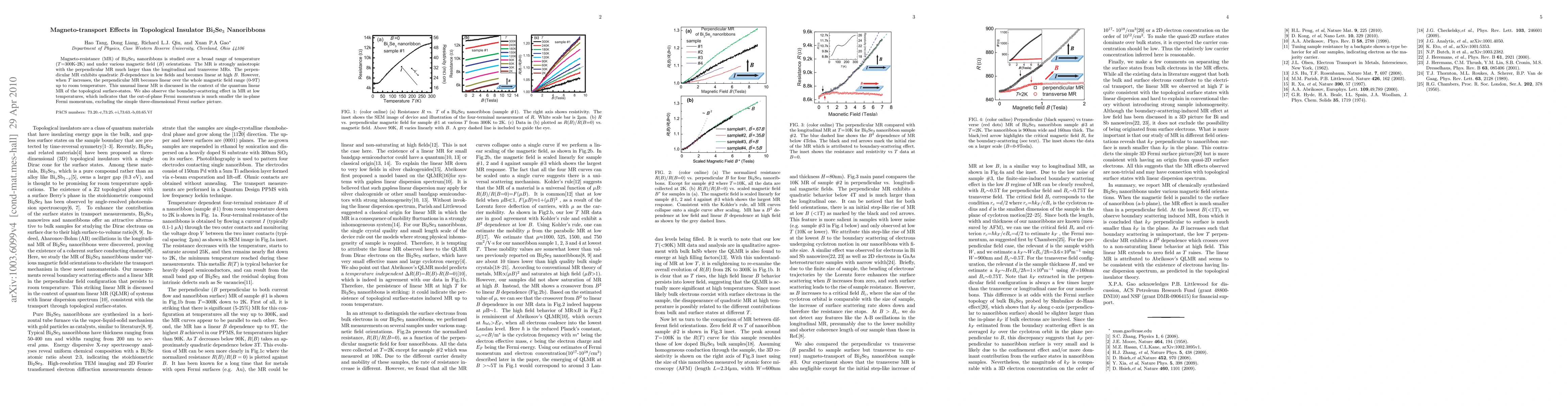 This study investigates the magneto-resistance (MR) of Bi$_2$Se$_3$ nanoribbons, revealing strong anisotropy with a significant quadratic to linear transition in the perpendicular MR under varying magnetic fields and temperatures. The findings suggest a linear MR at room temperature linked to topological surface states, and boundary-scattering effects indicate a complex Fermi surface structure.