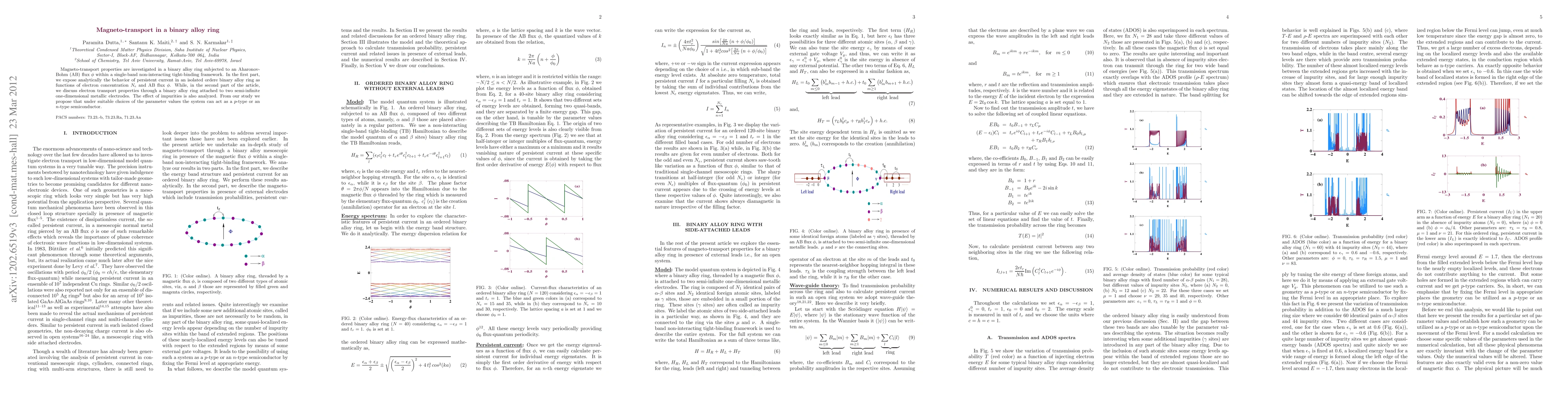 Magneto-transport properties are investigated in a binary alloy ring subjected to an Aharonov-Bohm (AB) flux \phi within a single-band non-interacting tight-binding framework. In the first part, we expose analytically the behavior of persistent current in an isolated ordered binary alloy ring as functions of electron concentration N_e and AB flux \phi. While, in the second part of the article, we discuss electron transport properties through a binary alloy ring attached to two semi-infinite one-dimensional metallic electrodes. The effect of impurities is also analyzed. From our study we propose that under suitable choices of the parameter values the system can act as a p-type or an n-type semiconductor.