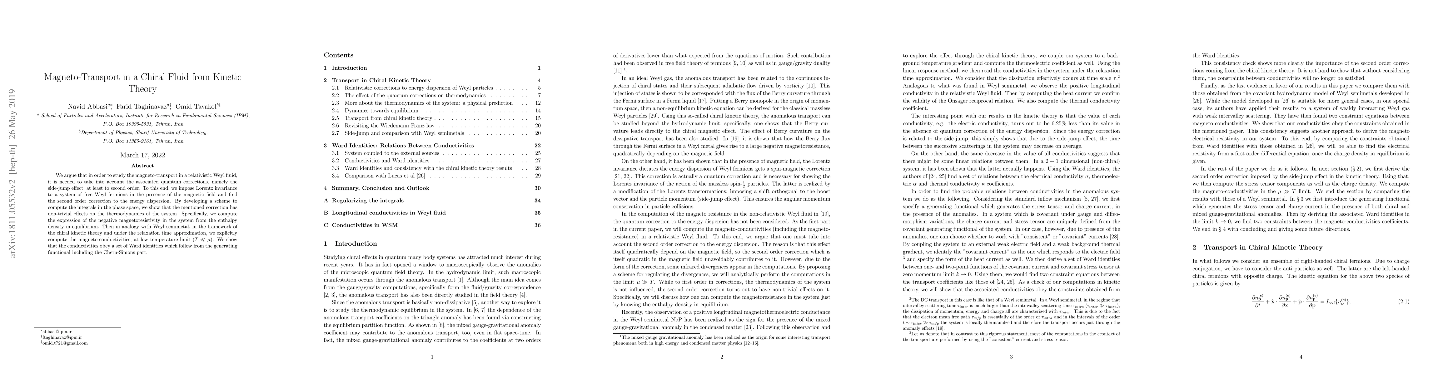We argue that in order to study the magneto-transport in a relativistic Weyl fluid, it is needed to take into account the associated quantum corrections, namely the side-jump effect, at least to second order. To this end, we impose Lorentz invariance to a system of free Weyl fermions in the presence of the magnetic field and find the second order correction to the energy dispersion. By developing a scheme to compute the integrals in the phase space, we show that the mentioned correction has non-trivial effects on the thermodynamics of the system. Specifically, we predict the form of the negative magnetoresistance in the system from the enthalpy density in equilibrium. Then in analogy with Weyl semimetal, in the framework of the chiral kinetic theory and under the relaxation time approximation, we explicitly compute the magneto-conductivities, at low temperature limit ($T\ll \mu$). We show that the conductivities obey the set of Ward identities which follow from the generating functional including the Chern-Simons part.