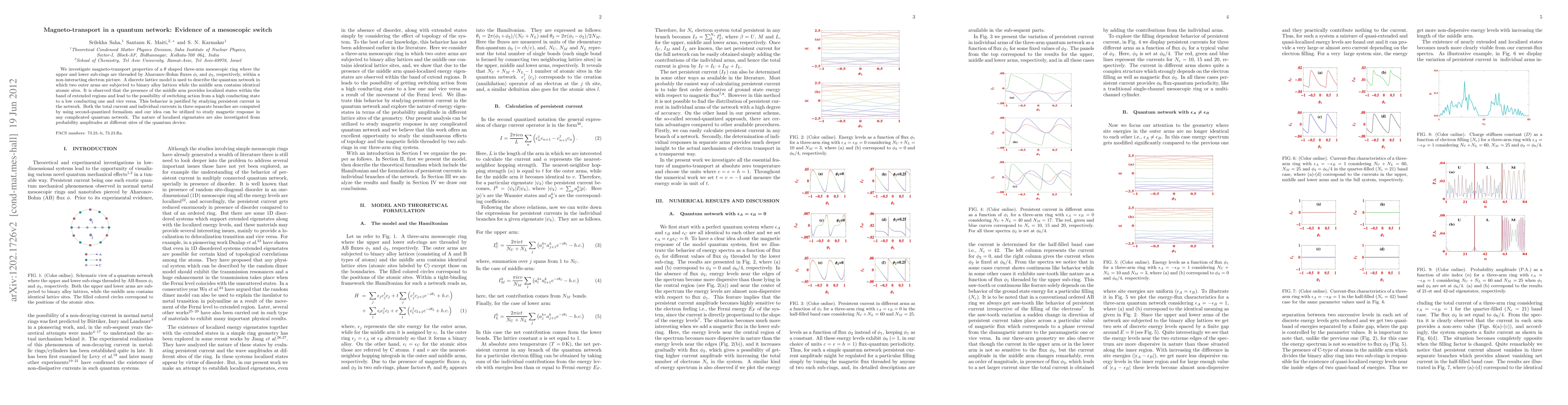 We investigate magneto-transport properties of a $\theta$ shaped three-arm mesoscopic ring where the upper and lower sub-rings are threaded by Aharonov-Bohm fluxes $\phi_1$ and $\phi_2$, respectively, within a non-interacting electron picture. A discrete lattice model is used to describe the quantum network in which two outer arms are subjected to binary alloy lattices while the middle arm contains identical atomic sites. It is observed that the presence of the middle arm provides localized states within the band of extended regions and lead to the possibility of switching action from a high conducting state to a low conducting one and vice versa. This behavior is justified by studying persistent current in the network. Both the total current and individual currents in three separate branches are computed by using second-quantized formalism and our idea can be utilized to study magnetic response in any complicated quantum network. The nature of localized eigenstates are also investigated from probability amplitudes at different sites of the quantum device.