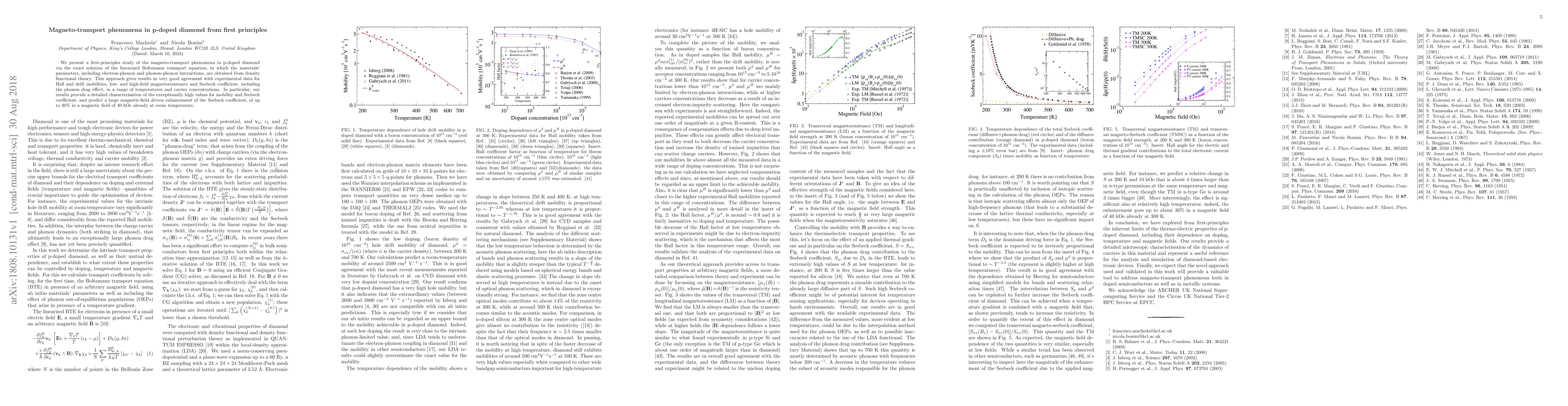 This study uses first-principles calculations to investigate magnetotransport in p-doped diamond, achieving high accuracy in predicting Hall and drift mobilities, magnetoresistance, and Seebeck coefficient. It reveals exceptionally high mobility and predicts a significant enhancement in the Seebeck coefficient under magnetic fields.