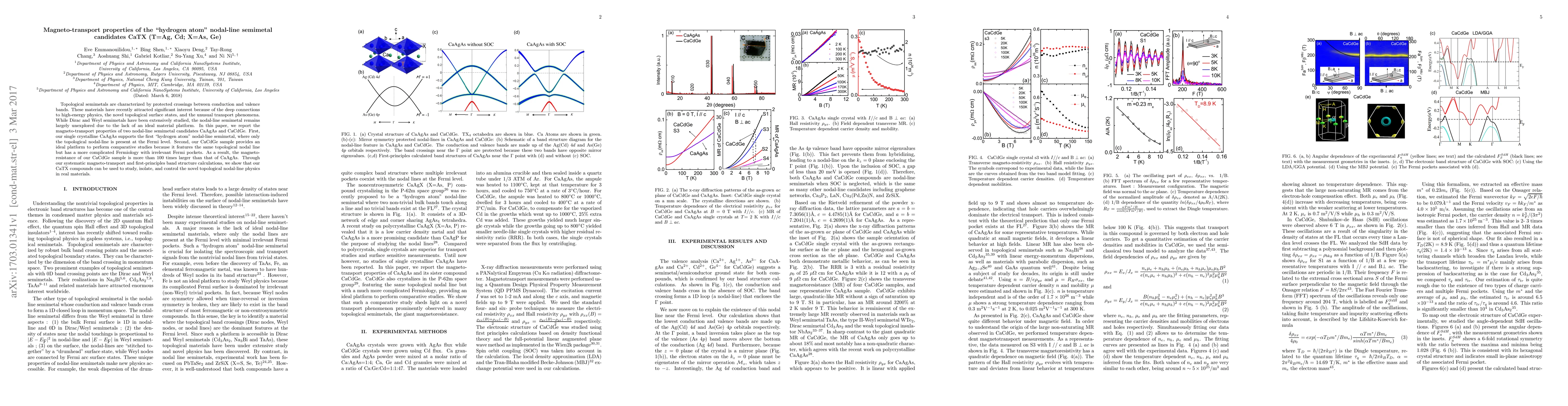 This paper investigates the magneto-transport properties of CaAgAs and CaCdGe, two candidates for "hydrogen atom" nodal-line semimetals. CaAgAs features a pure topological nodal-line at the Fermi level, while CaCdGe has a more complex Fermiology with additional irrelevant Fermi pockets, resulting in significantly higher magnetoresistance.
