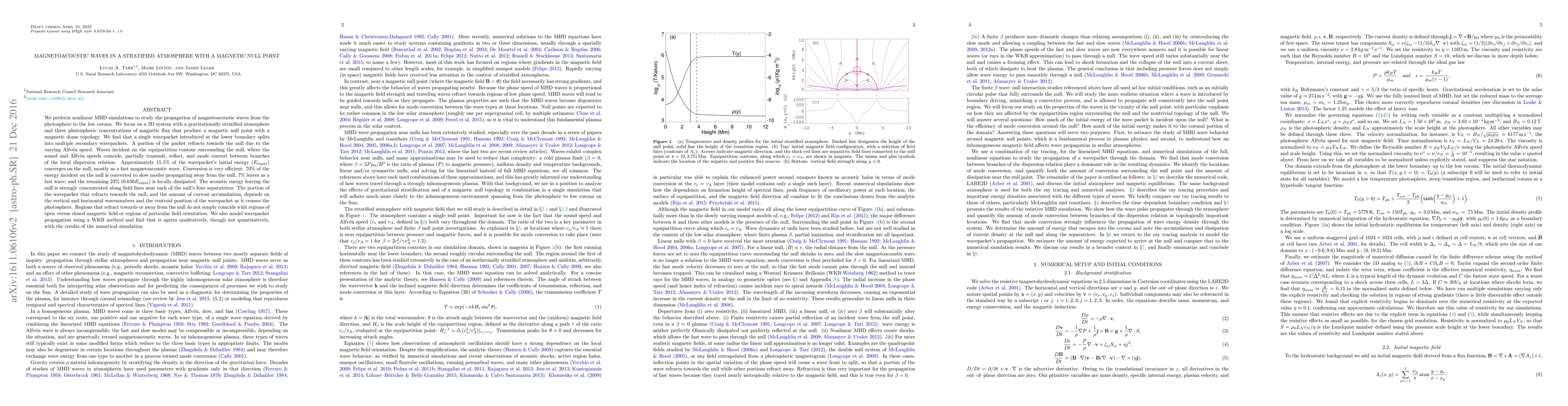 We perform nonlinear MHD simulations to study the propagation of magnetoacoustic waves from the photosphere to the low corona. We focus on a 2D system with a gravitationally stratified atmosphere and three photospheric concentrations of magnetic flux that give rise to a magnetic null point with a magnetic dome topology. We find that a single wavepacket introduced at the lower boundary splits into multiple secondary wavepackets. A portion of the packet refracts towards the null due to the varying Alfv\'en speed. Waves incident on the equipartition contour surrounding the null, where the sound and Alfv\'en speeds coincide, partially transmit, reflect, and mode convert between branches of the local dispersion relation. Approximately $15.5\%$ of the wavepacket's initial energy ($E_{input}$) converges on the null, mostly as a fast magnetoacoustic wave. Conversion is very efficient: $70\%$ of the energy incident on the null is converted to slow modes propagating away from the null, $7\%$ leaves as a fast wave, and the remaining $23\%$ (0.036$E_{input}$) is locally dissipated. The acoustic energy leaving the null is strongly concentrated along field lines near each of the null's four separatrices. The portion of the wavepacket that refracts towards the null, and the amount of current accumulation, depends on the vertical and horizontal wavenumbers and the centroid position of the wavepacket as it crosses the photosphere. Regions that refract towards or away from the null do not simply coincide with regions of open versus closed magnetic field or the local field orientation. We also modeled wavepacket propagation using a WKB method and found that it agrees qualitatively, though not quantitatively, with the results of the numerical simulation.