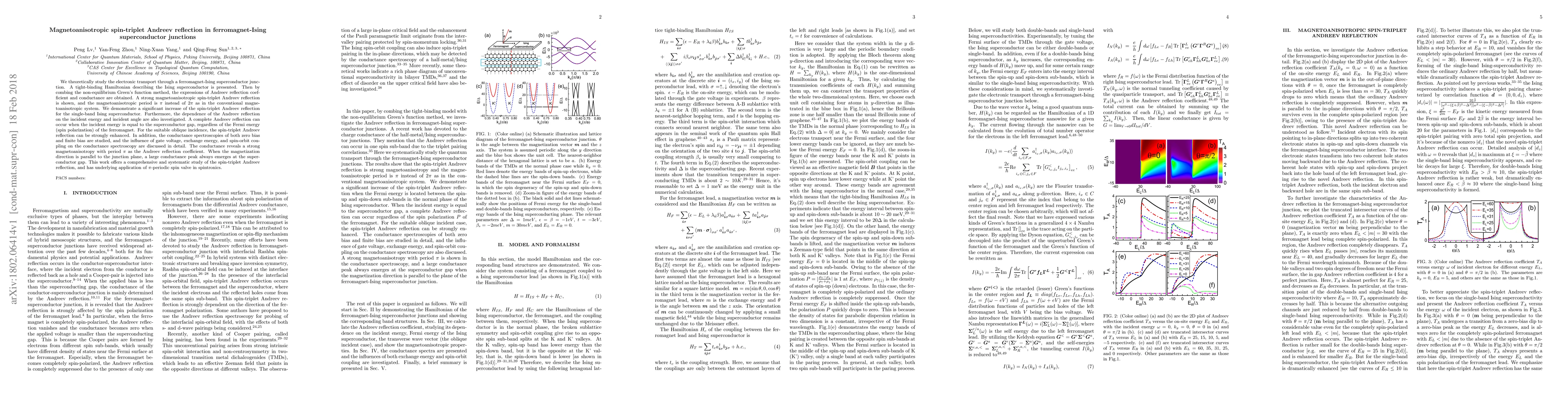 We theoretically study the electronic transport through a ferromagnet-Ising superconductor junction. A tight-binding Hamiltonian describing the Ising superconductor is presented. Then by combing the non-equilibrium Green's function method, the expressions of Andreev reflection coefficient and conductance are obtained. A strong magnetoanisotropic spin-triplet Andreev reflection is shown, and the magnetoanisotropic period is $\pi$ instead of $2\pi$ as in the conventional magnetoanisotropic system. We demonstrate a significant increase of the spin-triplet Andreev reflection for the single-band Ising superconductor. Furthermore, the dependence of the Andreev reflection on the incident energy and incident angle are also investigated. A complete Andreev reflection can occur when the incident energy is equal to the superconductor gap, regardless of the Fermi energy (spin polarization) of the ferromagnet. For the suitable oblique incidence, the spin-triplet Andreev reflection can be strongly enhanced. In addition, the conductance spectroscopies of both zero bias and finite bias are studied, and the influence of gate voltage, exchange energy, and spin-orbit coupling on the conductance spectroscopy are discussed in detail. The conductance reveals a strong magnetoanisotropy with period $\pi$ as the Andreev reflection coefficient. When the magnetization direction is parallel to the junction plane, a large conductance peak always emerges at the superconductor gap. This work offers a comprehensive and systematic study of the spin-triplet Andreev reflection, and has underlying application of $\pi$-periodic spin valve in spintronics.