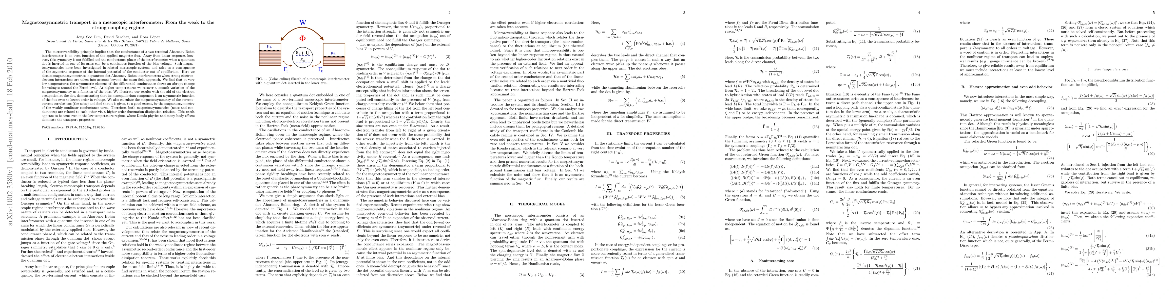 The microreversibility principle implies that the conductance of a two-terminal Aharonov-Bohm interferometer is an even function of the applied magnetic flux. Away from linear response, however, this symmetry is not fulfilled and the conductance phase of the interferometer when a quantum dot is inserted in one of its arms can be a continuous function of the bias voltage. Such magnetoasymmetries have been investigated in related mesoscopic systems and arise as a consequence of the asymetric response of the internal potential of the conductor out of equilibrium. Here we discuss magnetoasymmetries in quantum-dot Aharonov-Bohm interferometers when strong electron-electron interactions are taken into account beyond the mean-field approach. We find that at very low temperatures the asymmetric element of the differential conductance shows an abrupt change for voltages around the Fermi level. At higher temperatures we recover a smooth variation of the magnetoasymmetry as a function of the bias. We illustrate our results with the aid of the electron occupation at the dot, demonstrating that its nonequilibrium component is an asymmetric function of the flux even to lowest order in voltage. We also calculate the magnetoasymmetry of the current-current correlations (the noise) and find that it is given, to a good extent, by the magnetoasymmetry of the weakly nonlinear conductance term. Therefore, both magnetoasymmetries (noise and conductance) are related to each other via a higher-order fluctuation-dissipation relation. This result appears to be true even in the low temperature regime, where Kondo physics and many-body effects dominate the transport properties.
