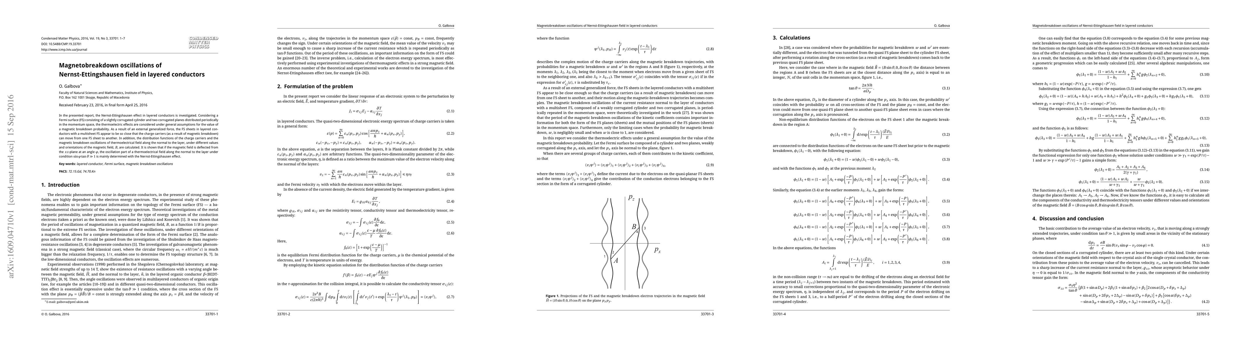 In the presented report, the Nernst-Ettingshausen effect in layered conductors is investigated. Considering a Fermi surface (FS) consisting of a slightly corrugated cylinder and two corrugated planes distributed periodically in the momentum space, the thermoelectric effects are considered under general assumptions for the value of a magnetic breakdown probability. As a result of an external generalized force, the FS sheets in layered conductors with a multisheet FS appear to be so close that the charge carriers (as a result of magnetic breakdown) can move from one FS sheet to another. In addition, the distribution functions of the charge carriers and the magnetic breakdown oscillations of thermoelectrical field along the normal to the layer, under different values and orientations of the magnetic field, $B$, are calculated. It is shown that if the magnetic field is deflected from the $xz$-plane at an angle $\varphi$, the oscillation part of a thermoelectrical field along the normal to the layer under condition $\sin\varphi\tan\vartheta \gg 1$ is mainly determined with the Nernst-Ettingshausen effect.
