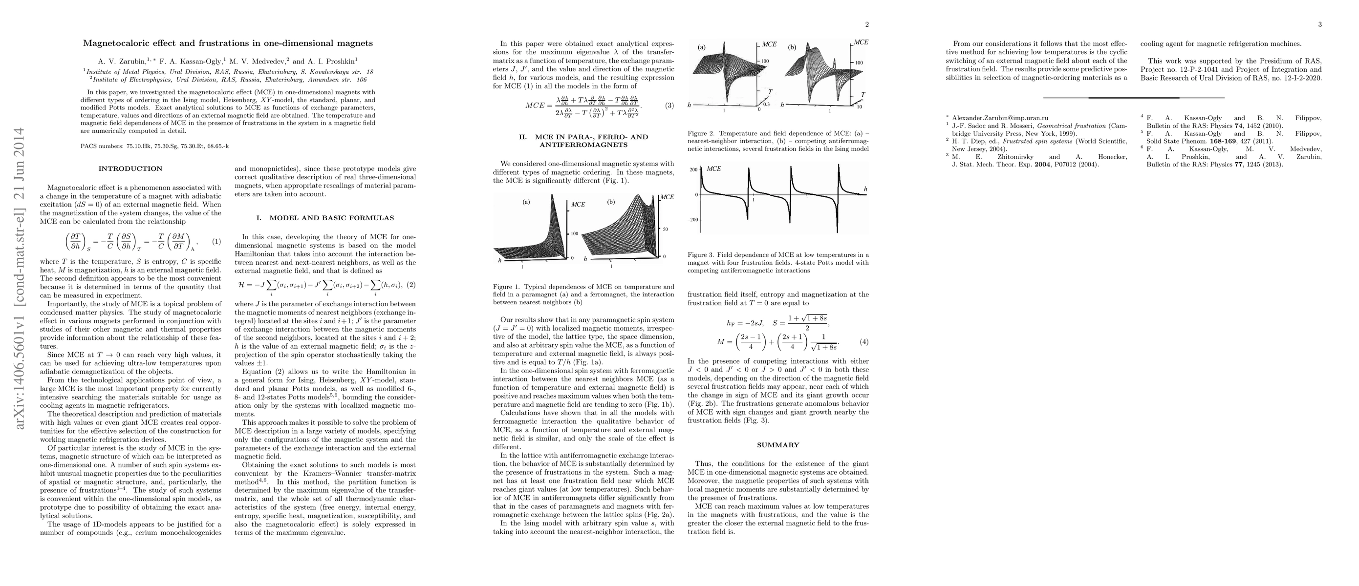 This paper investigates the magnetocaloric effect (MCE) in various one-dimensional magnet models, deriving exact analytical solutions for different ordering types and numerically analyzing the impact of frustrations under magnetic fields. The study provides detailed insights into the temperature and magnetic field dependencies of MCE.