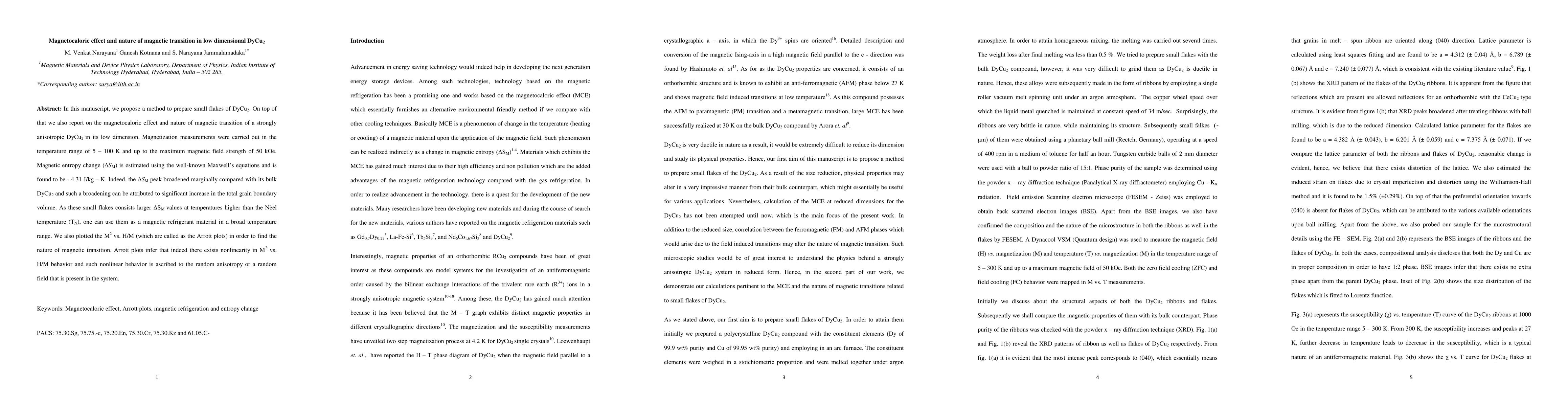 The research presents a method to prepare DyCu2 flakes and studies their magnetocaloric effect, revealing a magnetic entropy change of 4.31 J/kg K. The flakes, with larger delta SM values above TN, could serve as magnetic refrigerant material. The study also identifies nonlinear magnetic behavior due to random anisotropy or field in the system.