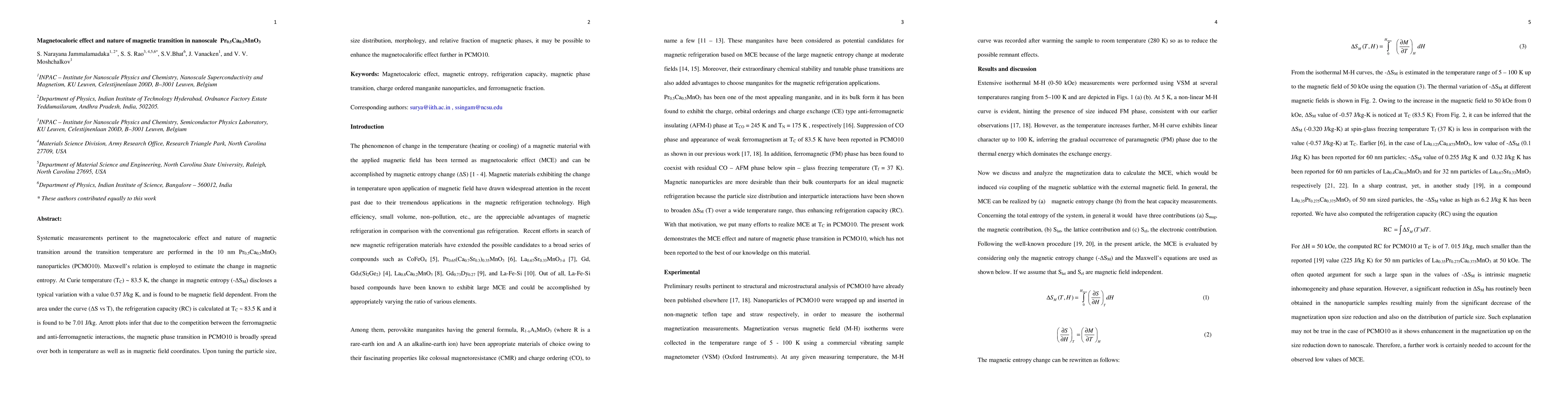 Researchers studied nanoscale Pr0.5Ca0.5MnO3 particles to enhance magnetocaloric effect, finding a magnetic field-dependent change in entropy at the Curie temperature of 83.5 K, with a refrigeration capacity of 7.01 J/kg.