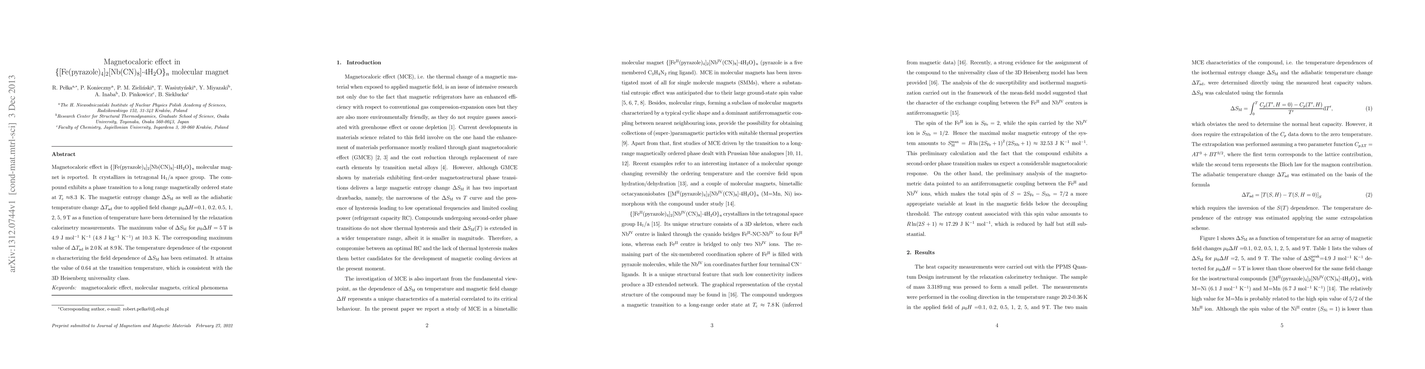 Magnetocaloric effect in {[Fe(pyrazole)$_4$]$_2$[Nb(CN)$_8$]$\cdot$4H$_2$O}$_n$ molecular magnet is reported. It crystallizes in tetragonal I4$_1$/a space group. The compound exhibits a phase transition to a long range magnetically ordered state at $T_\mathrm{c}\approx$8.3 K. The magnetic entropy change $\Delta S_\mathrm{M}$ as well as the adiabatic temperature change $\Delta T_\mathrm{ad}$ due to applied field change $\mu_0\Delta H$=0.1, 0.2, 0.5, 1, 2, 5, 9 T as a function of temperature have been determined by the relaxation calorimetry measurements. The maximum value of $\Delta S_\mathrm{M}$ for $\mu_0\Delta H=5$ T is 4.9 J mol$^{-1}$ K$^{-1}$ (4.8 J kg$^{-1}$ K$^{-1}$) at 10.3 K. The corresponding maximum value of $\Delta T_\mathrm{ad}$ is 2.0 K at 8.9 K. The temperature dependence of the exponent $n$ characterizing the field dependence of $\Delta S_\mathrm{M}$ has been estimated. It attains the value of 0.64 at the transition temperature, which is consistent with the 3D Heisenberg universality class.