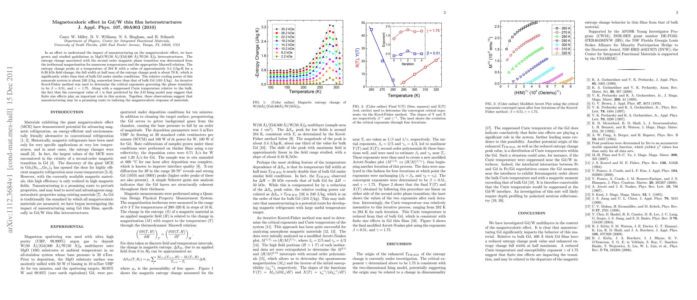 In an effort to understand the impact of nanostructuring on the magnetocaloric effect, we have grown and studied gadolinium in MgO/W(50 $\textrm{\AA}$)/[Gd(400 $\textrm{\AA}$)/W(50 $\textrm{\AA}$)]$_8$ heterostructures. The entropy change associated with the second order magnetic phase transition was determined from the isothermal magnetization for numerous temperatures and the appropriate Maxwell relation. The entropy change peaks at a temperature of 284 K with a value of approximately 3.4 J/kg-K for a 0-30 kOe field change; the full width at half max of the entropy change peak is about 70 K, which is significantly wider than that of bulk Gd under similar conditions. The relative cooling power of this nanoscale system is about 240 J/kg, somewhat lower than that of bulk Gd (410 J/kg). An iterative Kovel-Fisher method was used to determine the critical exponents governing the phase transition to be $\beta=0.51$, and $\gamma=1.75$. Along with a suppressed Curie temperature relative to the bulk, the fact that the convergent value of $\gamma$ is that predicted by the 2-D Ising model may suggest that finite size effects play an important role in this system. Together, these observations suggest that nanostructuring may be a promising route to tailoring the magnetocaloric response of materials.