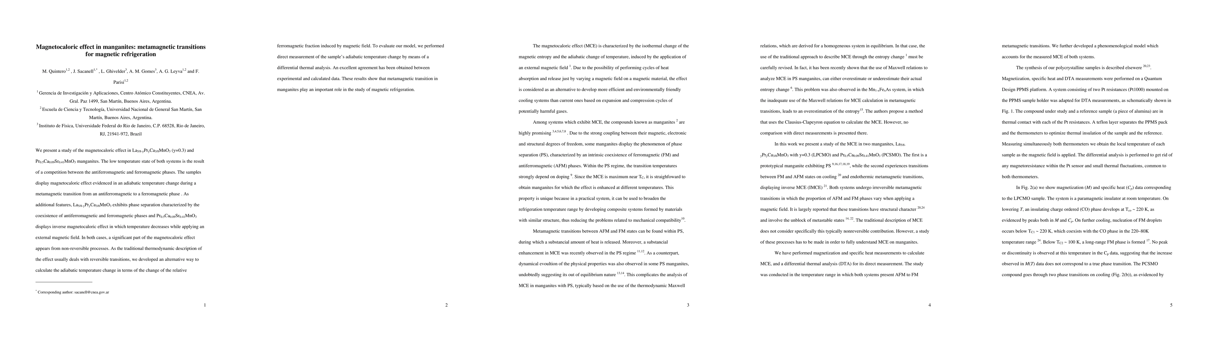 This study investigates the magnetocaloric effect in two manganites, La5/8-yPryCa3/8MnO3 and Pr0.5Ca0.09Sr0.41MnO3, revealing significant adiabatic temperature changes during metamagnetic transitions. The research proposes a novel method to account for non-reversible processes in these transitions, demonstrating its effectiveness through a good match between experimental and calculated data.